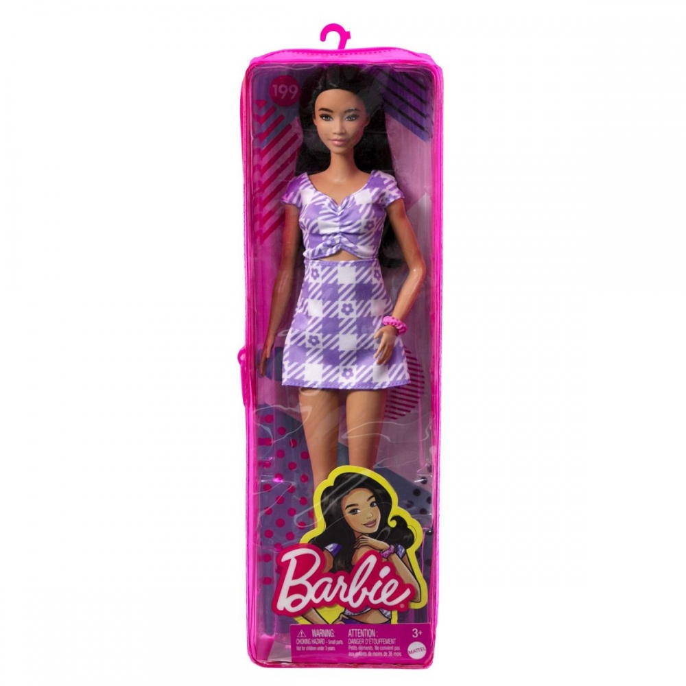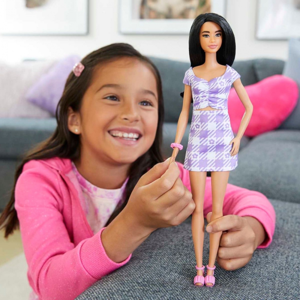Tato rozmanitá řada Barbie® Fashionistas™, navržená tak, aby odrážela svět, který dnes děti vidí, představuje jasné a trendy styly, které poskytují nekonečné možnosti vyprávění. Tato panenka Barbie® má vysoký typ postavy a černé vlasy upravené do jemných vln! Růžové scrunchie a sandály na nízkém podpatku dodávají dokonalé drobnosti, díky nimž vynikne její osobnost. Otočí hlavu v levandulových ginghamových šatech s nařaseným živůtkem a jemným výstřihem v pase! Opakovaně použitelná vinylová taška, navržená se zipem, pojme panenku nebo oblečení a doplňky Barbie®. Děti jej mohou používat pro hraní na cestách a ozdobit ho vlastními výtvarnými potřebami, jako jsou samolepky! Díky větší rozmanitosti je sbírání panenek Barbie® Fashionistas™ ještě zábavnější – jsou perfektním dárkem pro všechny děti. Věk: 3+