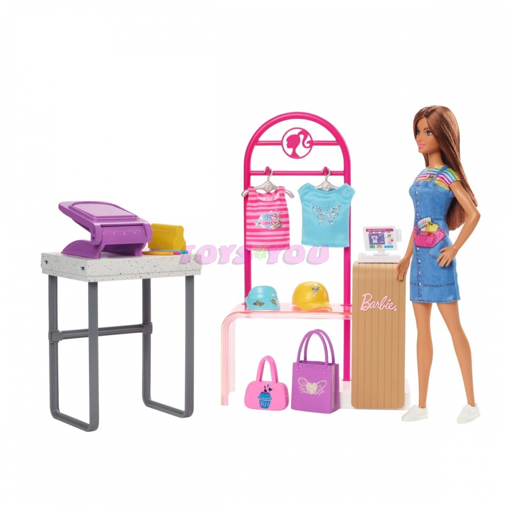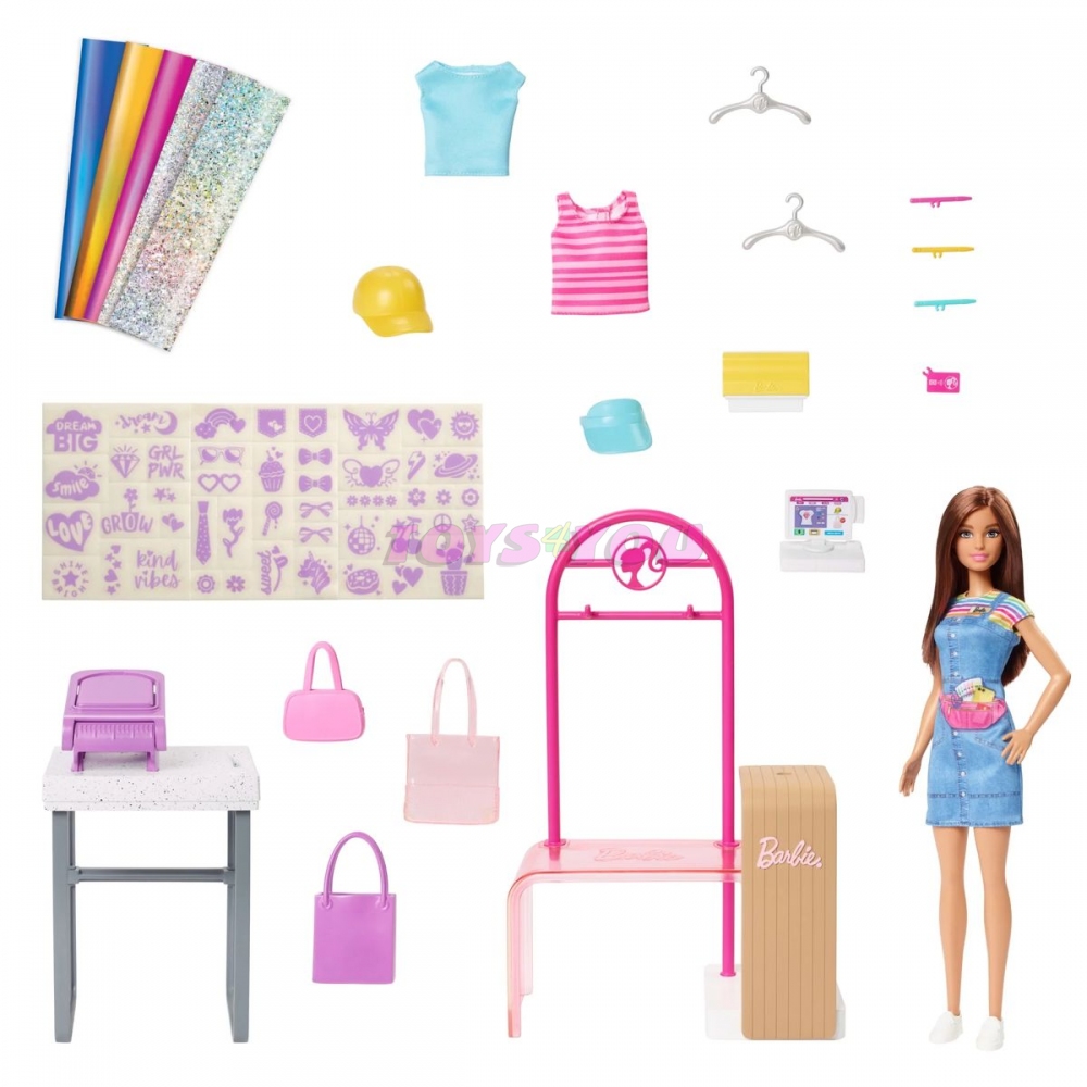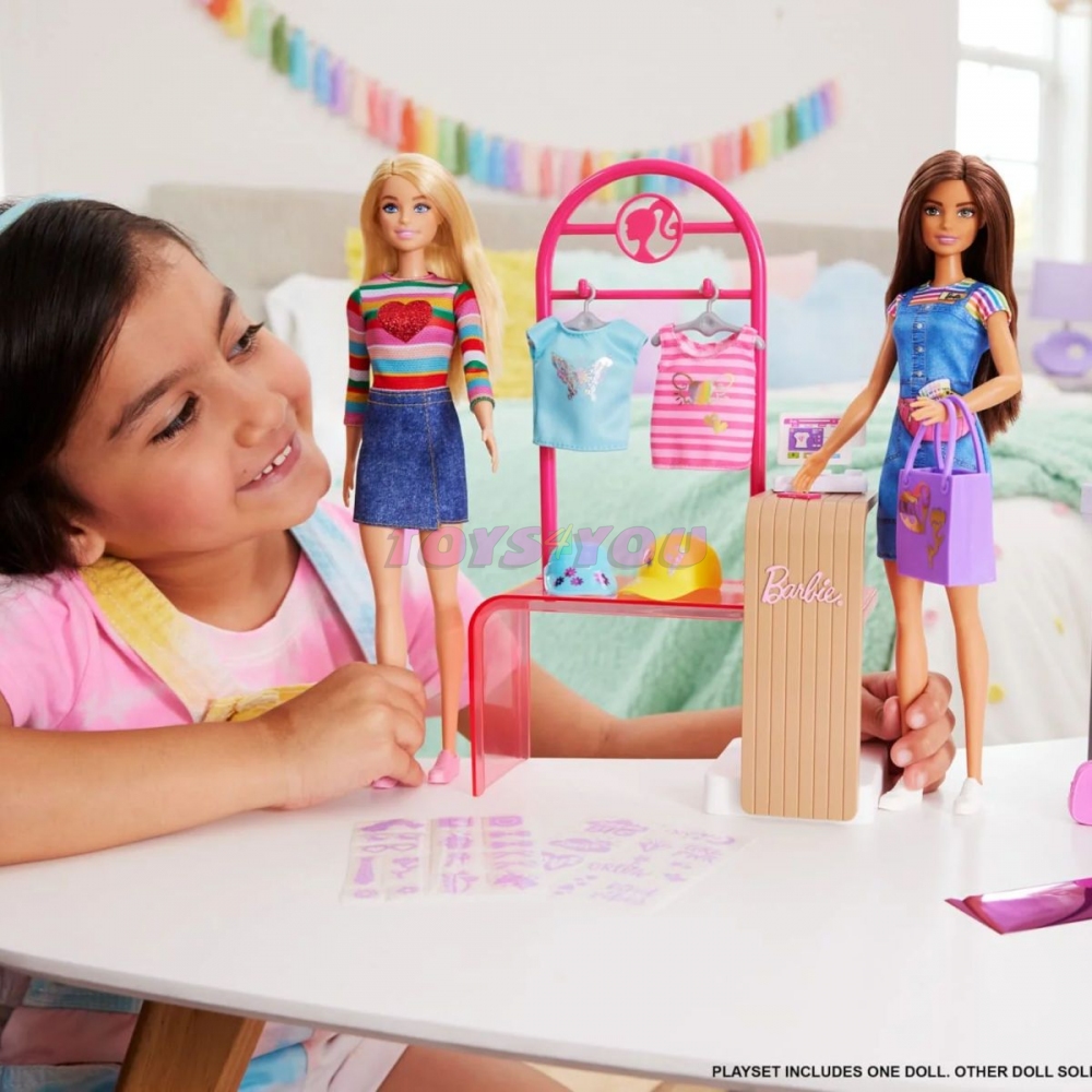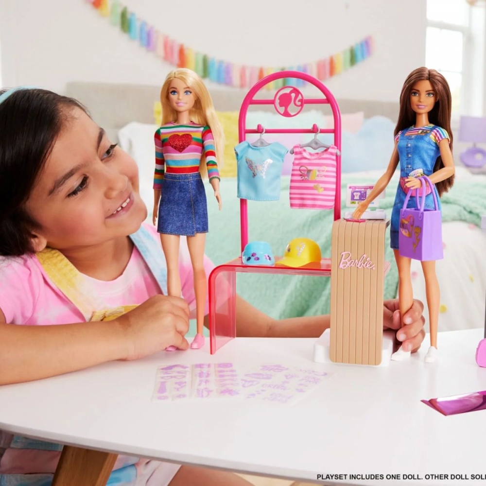 Děti mohou ušít kariéru v módě s panenkou Barbie® a herní sadou Make & Sell Boutique™! Mladí návrháři si zamilují vytváření vlastního vzhledu pomocí snadno použitelné funkce sítotisku fólie. Stojan a věšáky předvádějí originální návrhy k nákupu a zákazníci mohou nakupovat s realistickou registrací a čtečkou karet! Pět fólií a opakovaně použitelné samolepky umožňují opakovat zábavu a nekonečné možnosti. Panenka nemůže stát sama. Barvy a dekorace se mohou lišit.