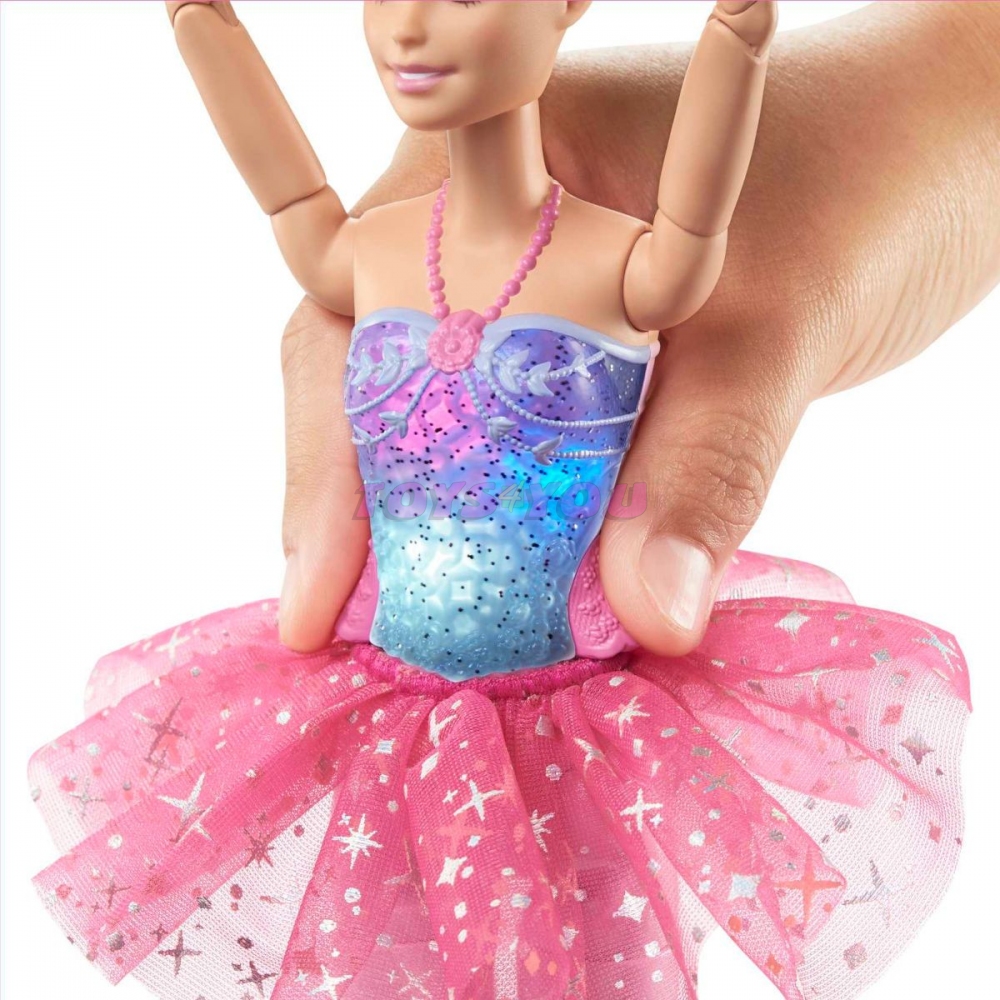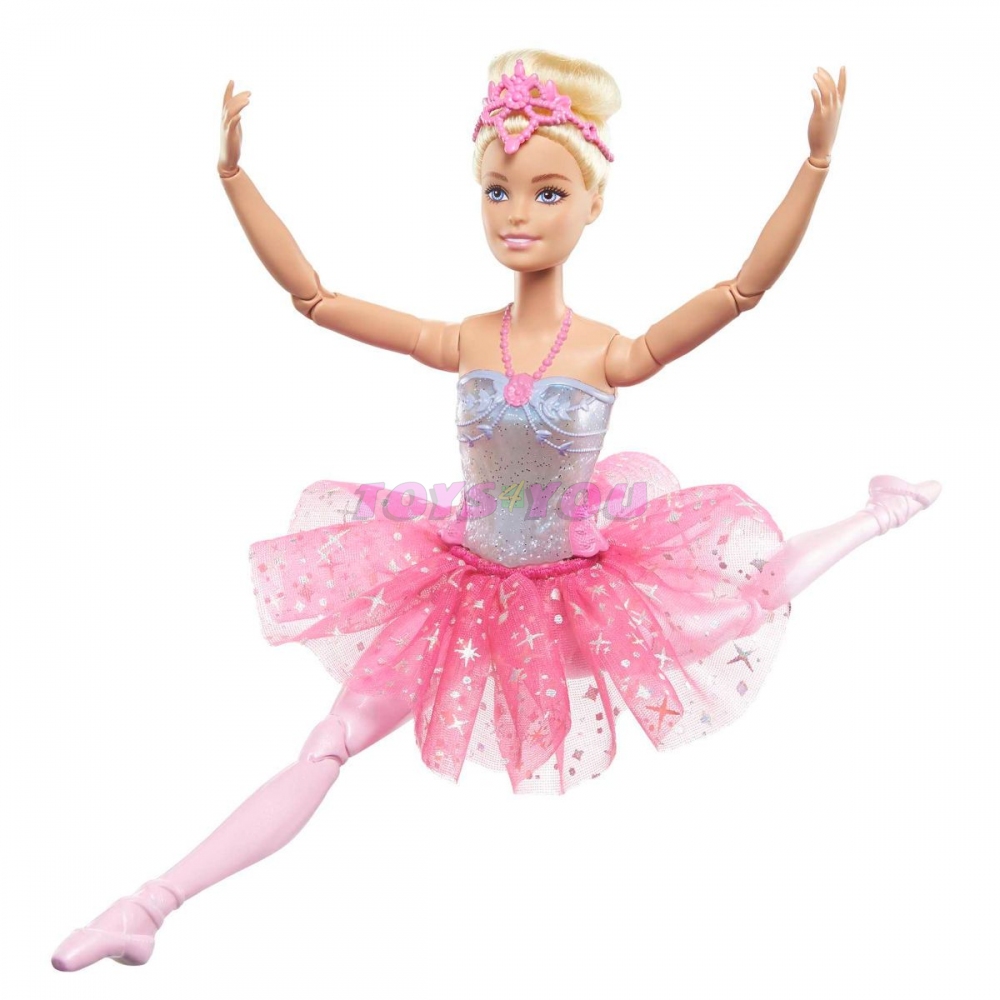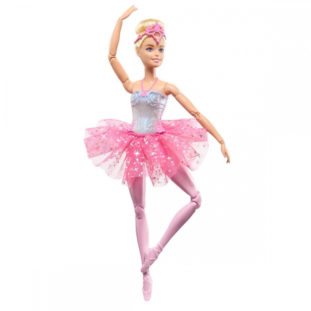 Na baletu je všechno kouzelnější! Sledujte, jak se balerínky Barbie® třpytí a září při tanci s třpytivými svítícími detaily. Panenka Barbie® má blond vlasy upravené do klasického drdolu a zakončené elegantní diadémem! Stiskněte tlačítko na baletce v pase a sledujte, jak se její živůtek rozsvítí! Přichází s pěti světelnými show, které mají různé barevné variace. Panenka Barbie® se stylově točí v zářivě růžovém tutu a vyřezávaných baletních pantoflích. Je kloubová, takže děti mohou prozkoumat taneční vyprávění a postavit ji v různých postojích! Ve fantastické zemi Barbie® je možné všechno! Děti ve věku od 3 let mohou sbírat další panenky a herní sady, aby dále podněcovaly svou představivost a prozkoumávaly hraní rolí. Věk:3+