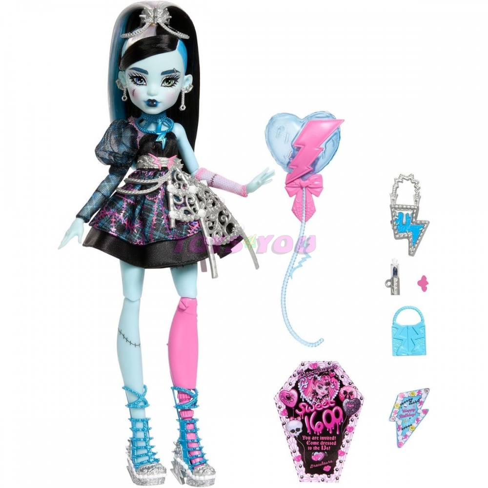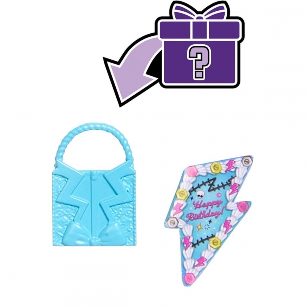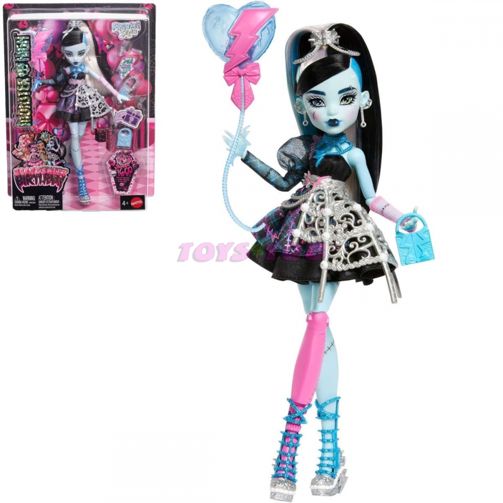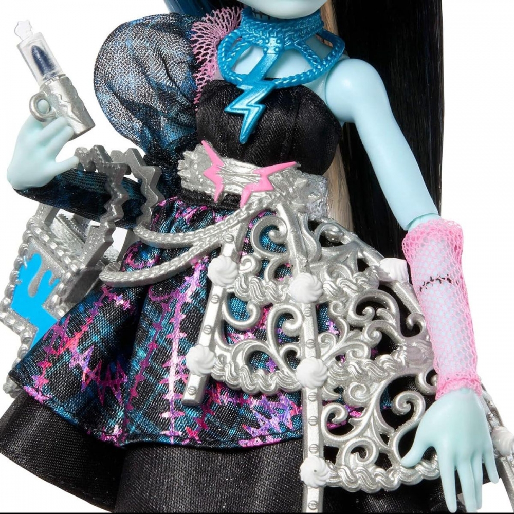 Draculaura se slaví v roce 1600 a žákovství Monster High slaví párty Scary Sweet Birthday! Frankie kamenná panenka je připravena na elektrizující vystoupení v elegantním oblečení a s příslušenstvím. Váš party fit stříká energií jen takhle! Kostkované rukávy a rozšířená sukně jí propůjčují určitou výjimečnost. Řetízek na krk s bleskem a boty s nýty na vysokém podpatku doplňují svůj stylový vzhled. Příslušenství na téma party zajišťuje perfektní náladu u Scary Sweet Birthday. K dispozici je například dárková taška s překvapivým dárkem! Pozvánka a přání k narozeninám jsou rovněž součástí dodávky. Díky stylingovým doplňkům, jako je modrá rtěnka a kabelka, mají děti křiklavě spoustu legrace při stylingu panenky Frankie na půlnoční párty své přítelkyně! Pro každou party platí: čím více, tím lépe! Další panenky z kolekce Monster High Scary Sweet Birthday doplňují celou hrůzostrašnou posádku a společně slaví strašidelnou oslavu. . Prodává se samostatně a podle dostupnosti. Panenka je plně kloubová. Barvy a dekorace se mohou lišit. Věk: 4+