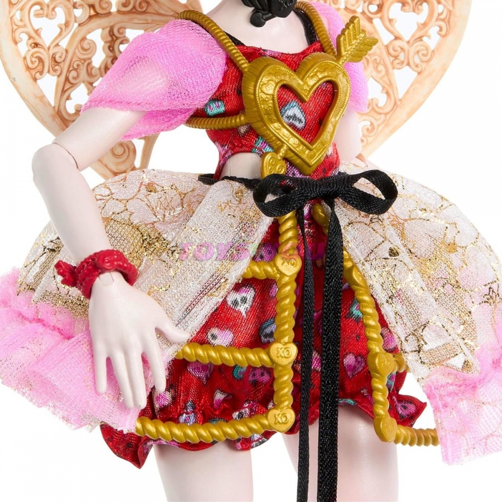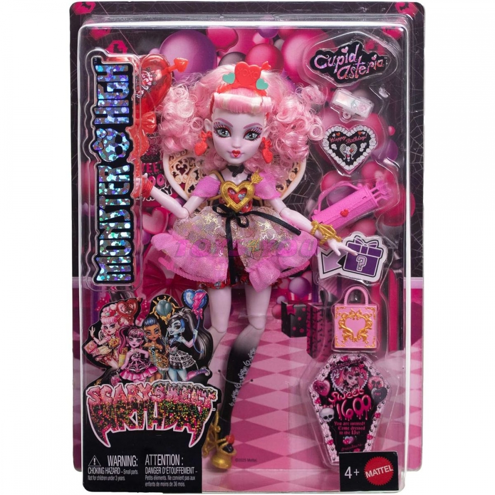 Draculaura slaví 1600. výročí a studenti Monster High to slaví strašidelnou narozeninovou párty! Panenka Cupid Asteria je připravena na strašidelný vzhled v elegantním oblečení a doplňcích. Cupid Asteria vyrostla na hoře Olymp a miluje lásku! Rychle si nachází přátele, ráda dává rady a vznáší se hvězdnými nocemi na svých kostěných křídlech. Její párty look je strašně volánový! Pod třpytivými šaty se mihotají červené kalhotky s potiskem srdíček. Detail se srdcem propíchnutým šípem a náramkem z kuše doplňuje její outfit! Párty doplňky vytvářejí dokonalou atmosféru strašidelných narozenin. Součástí je dárková taška pro Draculauru s překvapivým dárkem uvnitř! Součástí je také pozvánka a narozeninová karta. Se stylingovými doplňky, jako je sáček na šipky a paleta očních stínů, si děti užijí děsivou zábavu při stylingu panenky Cupid Asteria na půlnoční párty svých kamarádů. Na jakoukoli párty platí, že čím více, tím lépe! Další panenky z kolekce Monster High Scary Sweet Birthday doplňují celou strašidelnou posádku a společně oslavují strašidelné slavnosti. Prodává se samostatně a podle dostupnosti. Panenka je plně kloubová. Barvy a dekorace se mohou lišit. Věk: 4+