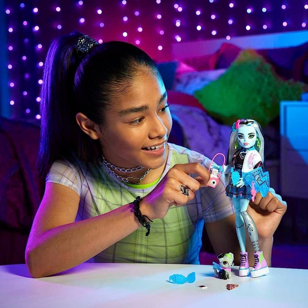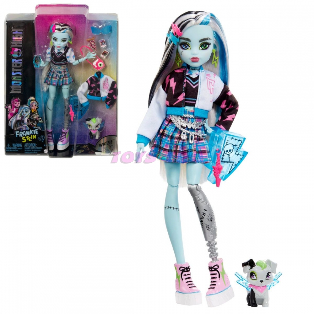 Pravý hrůzostrašný týmový duch dokázat více Monster High! Děti od 3 let mohou shromáždit všechny žákyně Monster High a mít strašně spoustu zábavy!Démonická panenka pro všechny milovníky seriálu Monster High! Frankie Stein je energická příšerka s modrou pokožkou, protetickou nohou a doopravdy elektrizujícím módním stylem. Místo uniformy se po chodbách školy pro příšerky prochází v krátké sukni, blůzce a růžových teniskách na mohutné platformě. Součástí balení jsou také stylové doplňky a rozkošný mazlíček, pejsek Watzie. Barvy a provedení se mohou lišit. Věk: 3+