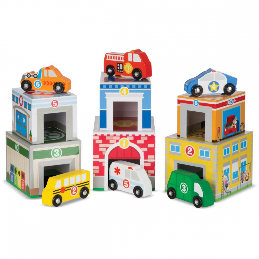 Šest bloků ke stavění, vkládání a řazení, ale i zapadající jeden do druhého a šest dopravních prostředků, které mohou zajet dovnitř jako do garáže. Děti mají tolik možností, jak si s touto skvělou hračkou hrát. Schovávat a hledat, počítat, stavět na sebe, vedle sebe od nejmenšího do největšího a spoustu dalších možností. Tato hračka umožňuje dětem stavět věže nebo posatvit město s nemocnicí, hasičskou stanicí, školou a to s dřevěným dopravním prostředkem určeným pro každou budovu. Děti také mohou párovat dopravní prostředky s budovami podle čísel nebo barev.Procvičí si tím jemnou motoriku, fantazii, představivost a učí se barvy, čísla a zdokonalí mnoho dalších schopností. Obsahuje: 6 budov a 6 dřevěných dopravních prostředků. Rozměry: 39,5 x 16 x 14,2 cm. Věk: 3+