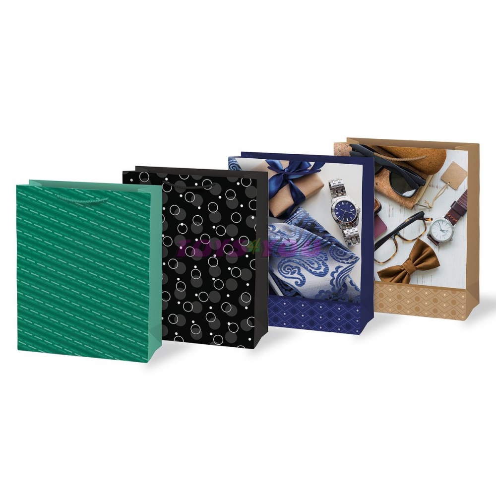 Papírová dárková taška T5 v různých pánských motivech a barvách. Taška je vybavena uchy pro snadné přenášení a je vhodná pro různé příležitosti jako jsou narozeniny, svátky, svatby, nebo jiné speciální události. Pohodlná ucha jsou z pevného materiálu, která zajišťují snadné přenášení. Dejte svým blízkým najevo, že Vám na nich záleží, a darujte jim dárek v elegantní a stylové tašce. Motiv: mix motivů Rozměr: 260 x 320 x 138 mm Dodáváme dle skladové zásoby. Uvedená cena je za 1 ks.