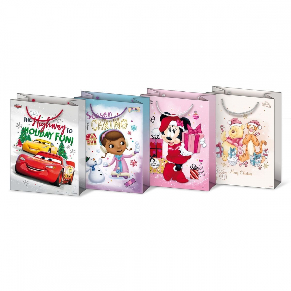 Papírová dárková taška s vánočními Disney motivy (Auta, Medvídek Pú, Minnie Mouse). Taška má pevné ucho pro snadné přenášení a štítek pro vepsání jména či přání. Rozměr: 190mm x 250mm x 90mm (Š x V x H)