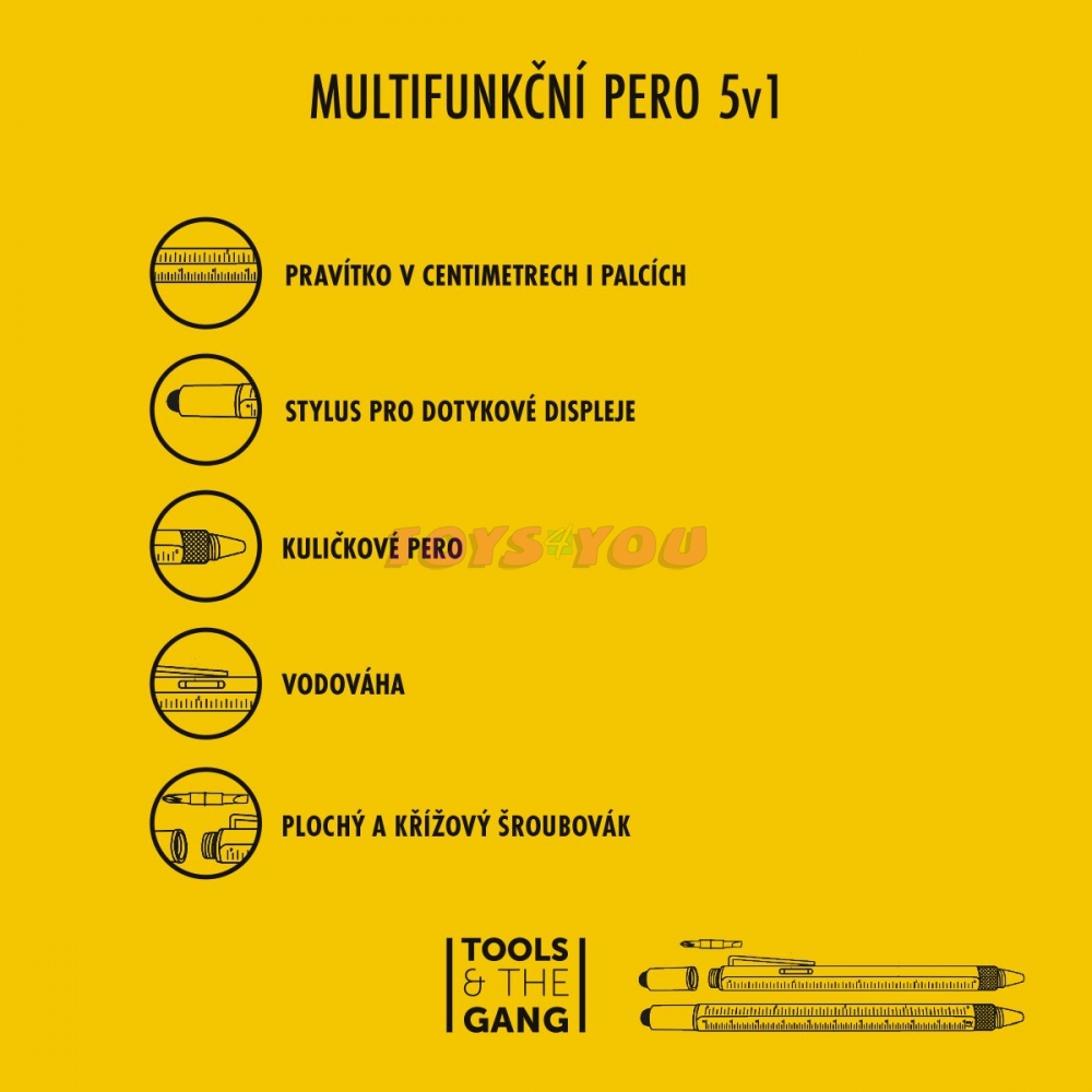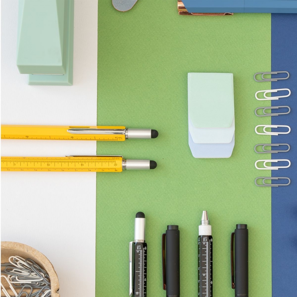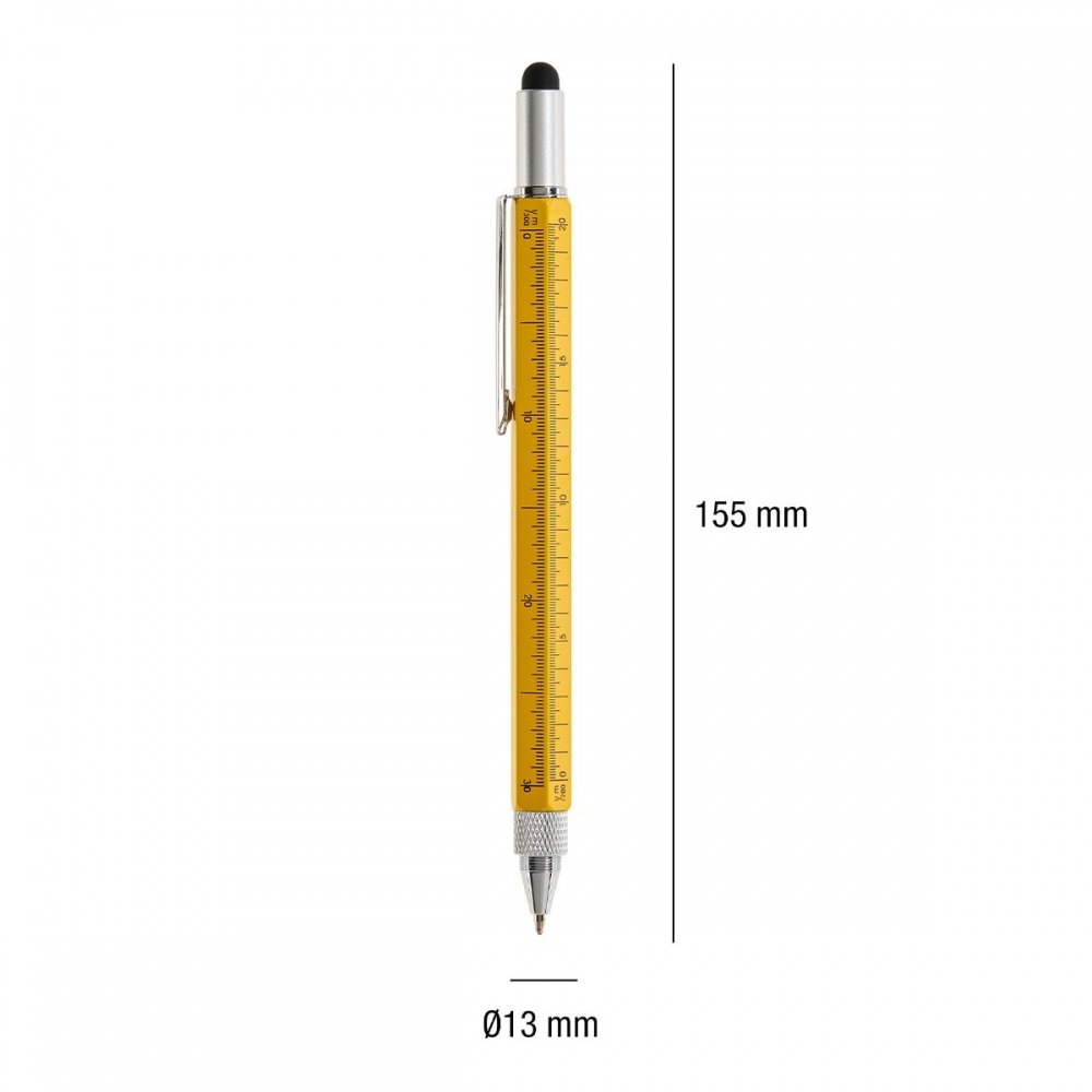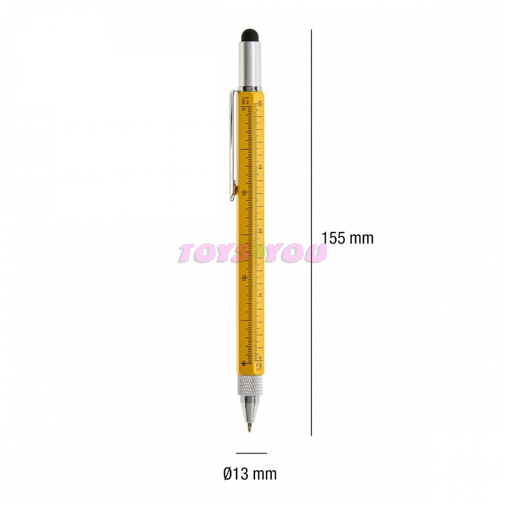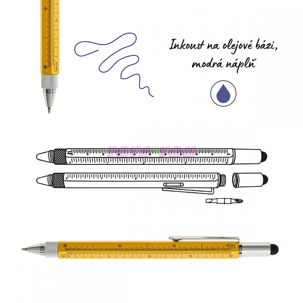 Multifunkční kuličkové pero spojuje elegantní psací nástroj s pěti užitečnými funkcemi, které využijete doma, v kanceláři i na cestách. Skvělé vychytávky, které máte vždy po ruce. Kromě kuličkového pera obsahuje pravítko v centimetrech i palcích, vodováhu, plochý a křížový šroubovák a dotykový stylus pro smartphony a tablety. Modrá náplň, inkoust na olejové bázi, který hladce klouže po papíru. Sada per v displeji a barevném mixu černé, stříbrné a žluté. rozměry pera: 155 × O 13 mm barva náplně: modrá stiskací mechanika mix barev: černá, stříbrná, hořčičná 5 v 1: kuličkové pero, pravítko v centimetrech i palcích, vodováha, plochý a křížový šroubovák, dotykový stylus pro tablety a smartphony obsah balení: 12 ks/displej. Rozměr balení (mm): 250x460x250. Cena za jeden kus.