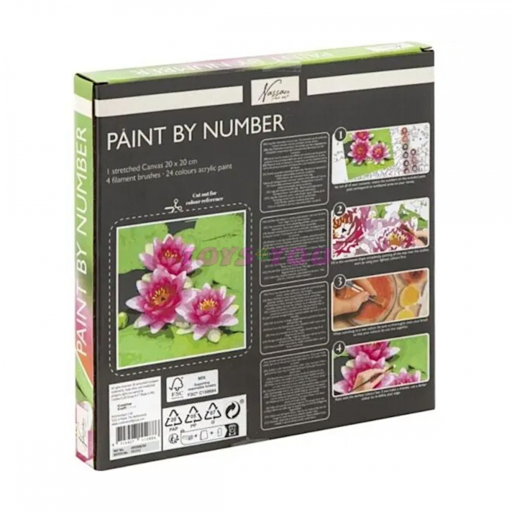 Vymalujte si svůj obrázek na plátno podle čísel je to skvělé na odreagování. Vlastnoručně namalovaný obraz si můžete vystavit kdekoliv v domě. Každé číslo má svou barvu, čísla po vymalování nejsou vidět. Ideální jako dárek. Rozměr: 20 x 20 cm Sada obsahuje: - plátno zalisované v pevném kartonu - barevná předloha, kterou si vystřihnete ze zadní strany krabice - 4 ks štětců - sada 24 kvalitních akrylových barev Věk: 8+ Postup: Vyčistěte oblast pro práci. Zakryjte ji starými novinami nebo papírem, aby byla čistá. Připravte si láhev vody na mytí štětce. Nyní můžete začít malovat. Malujte raději jednu barvu po druhé, od největších ploch po ty nejmenší, od horní části obrazu až dolů. Začnete-li s většími plochami, budete si pak jistější u těch malých, které jsou docela ošemetné. Pokud se vám líbí, jak malování dopadlo, můžete si svůj výtvor zarámovat nebo pověsit na zeď jen tak. Věk: 8+.