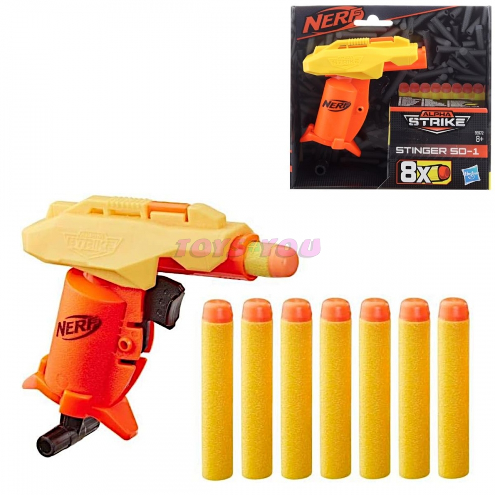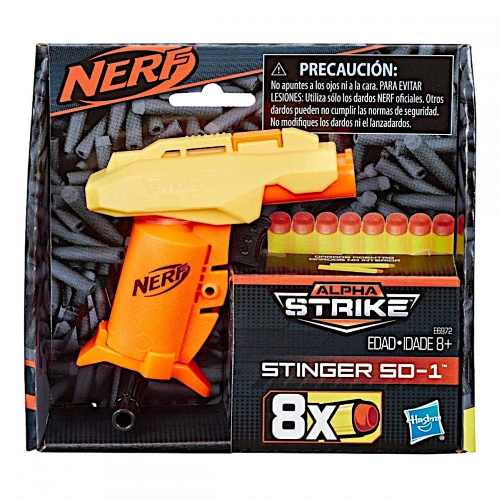 Blastr Nerf Alpha Strike Stinger SD-1 střílí šipky jednu po druhé a snadno se používá: Vložte do hlavně 1 šipku, nabijte zatažením za rukojeť a střílejte stisknutím spouště. Malý a přenosný, skvělý pro přepadení a rychlé bitvy. Dodává se s 8 originálními šipkami Nerf Elite. Nevyžaduje baterie. Rozměr balení cca 16,5 x 14,5 x 4,5 cm. Doporučuje se ochranné brýle (nejsou součástí balení). Věk: 8+