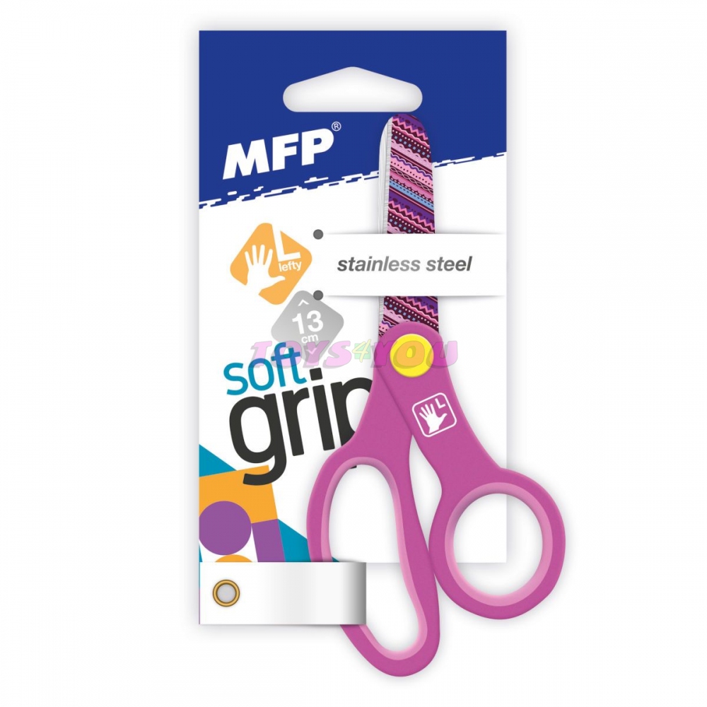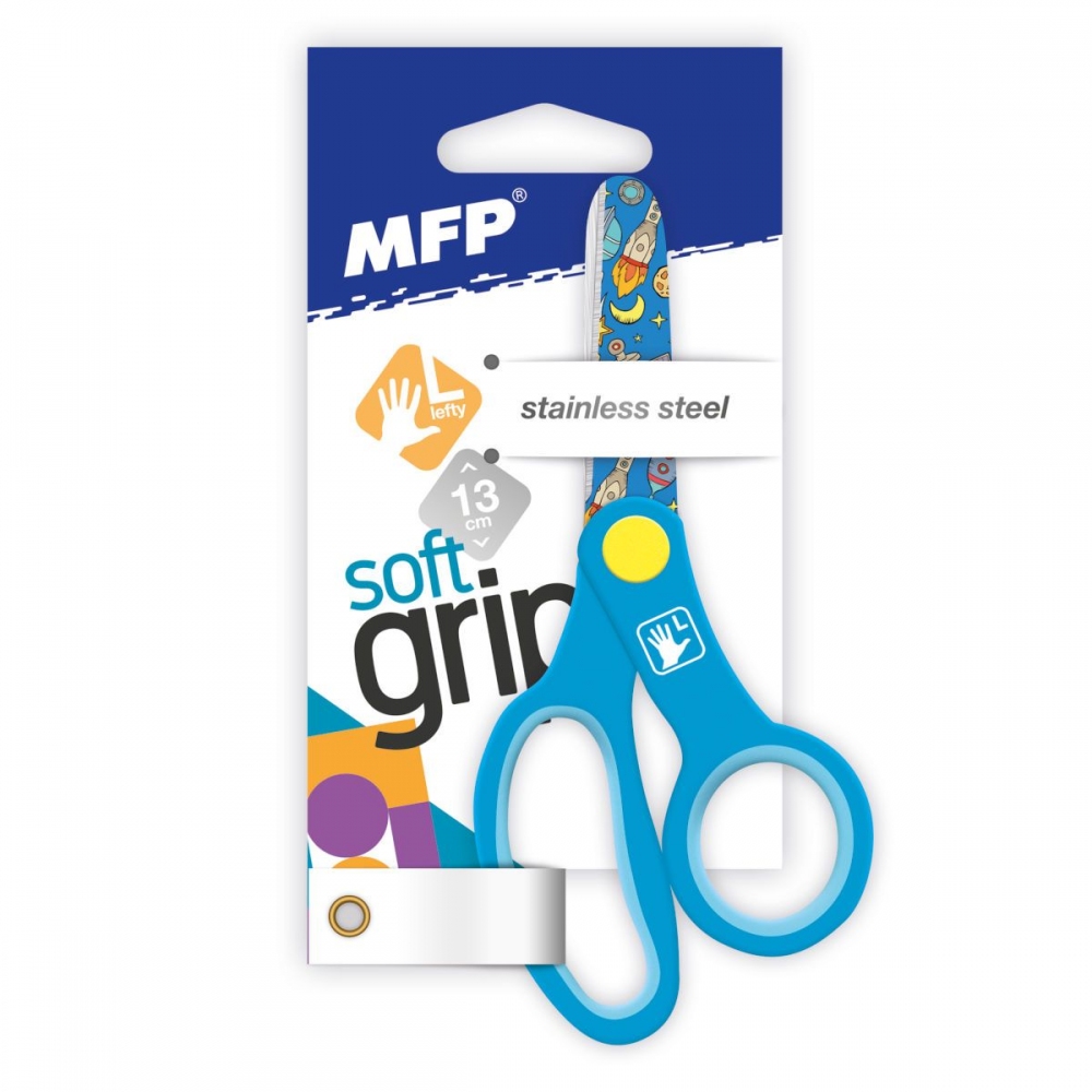 Dětské nůžky pro leváky s barevným potiskem na nožích o velikosti 130 mm. Nůžky mají zaoblenou špičku, měkkou ergonomickou rukojeť a jsou vhodné do kanceláře i domácnosti. Nabízíme ve 2 provedeních: modré - rakety, růžové - čáry Délka břitu od středu nýtu: 55 mm Varování: Není vhodné pro děti do 3 let. Ostré hrany! Dodáváme v mixu po 2 ks dle skladové zásoby. Uvedená cena je za 1 ks. Rozměr: 60mm x 130mm x 8mm (Š x V x H)