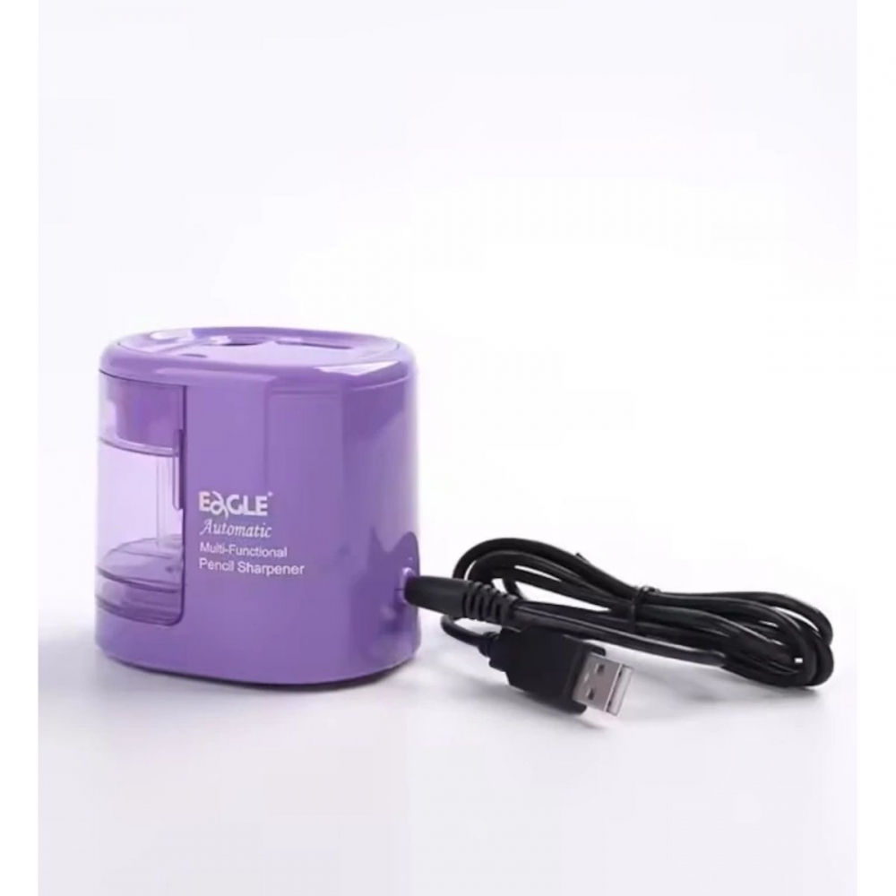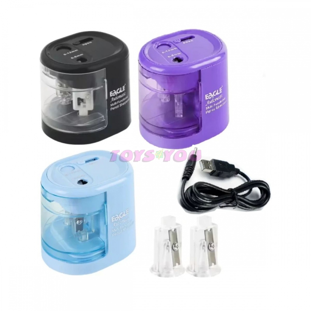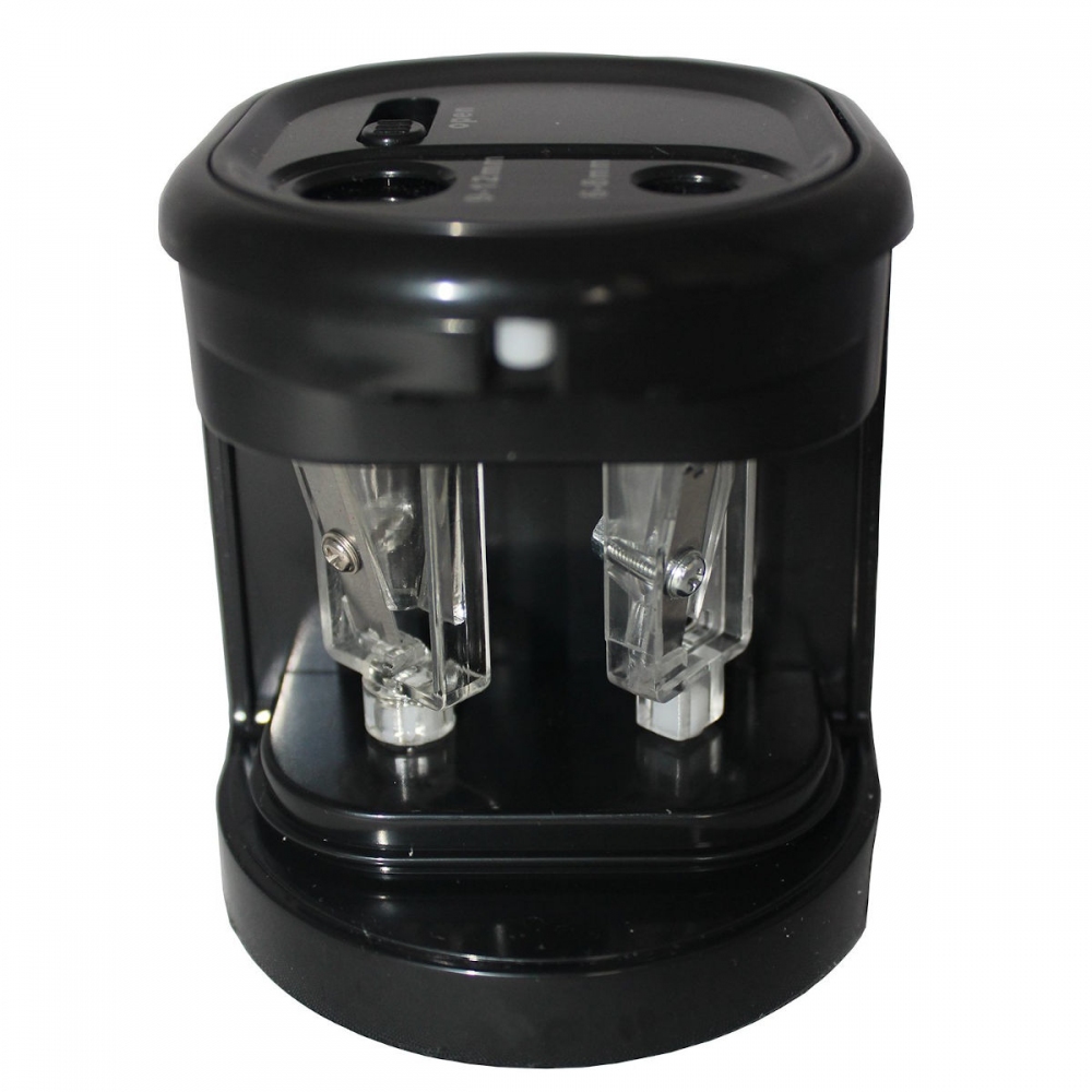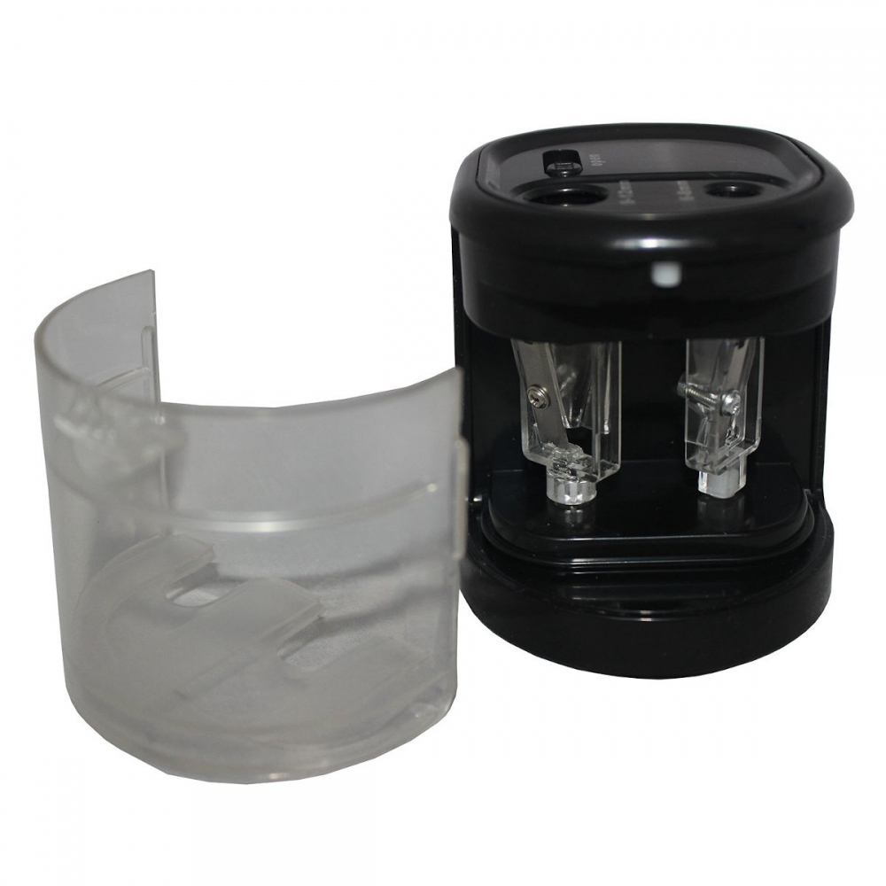 Ořezávátko stolní elektrické. Dva otvorry, pro tužky o velikosti 6–8 a 9–12 mm, zámek s mikrospínačem bezpečný pro děti, vyměnitelné nože, pro baterie AA (4 ks, nejsou součástí balení), kabel USB, stabilní základna