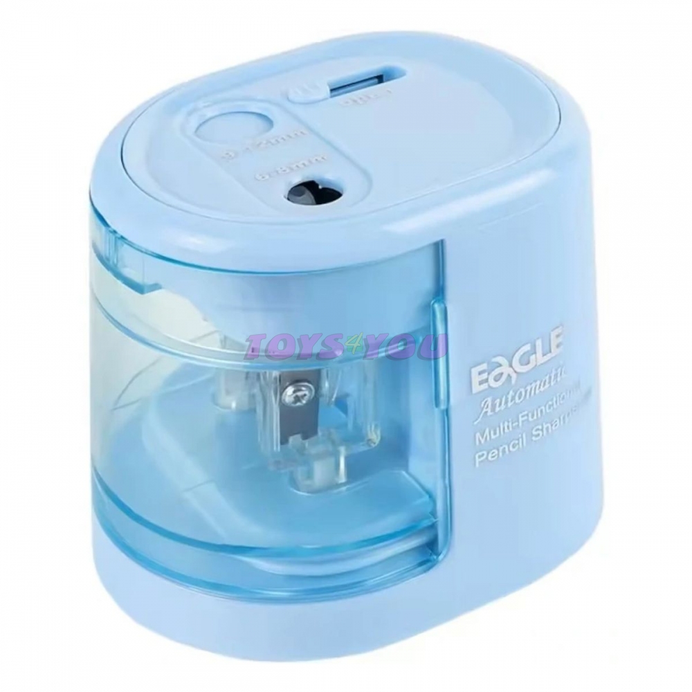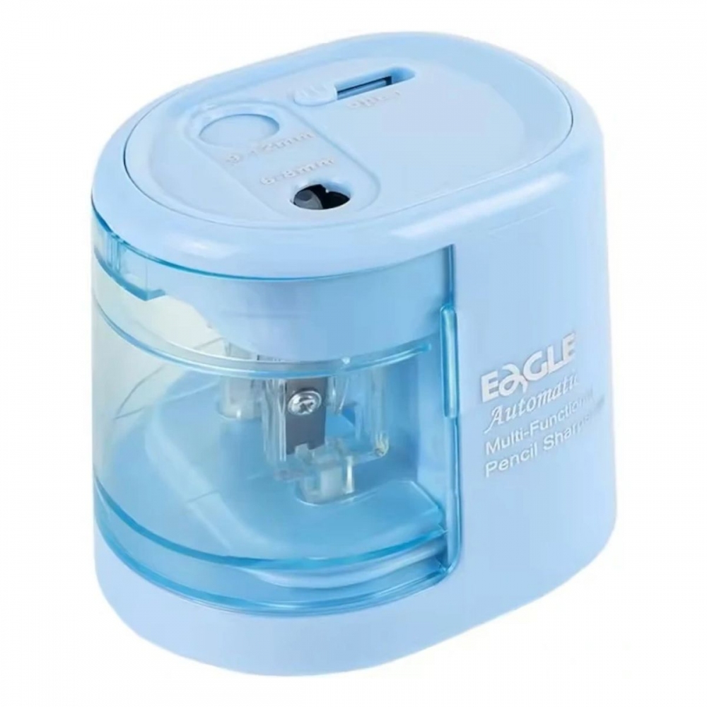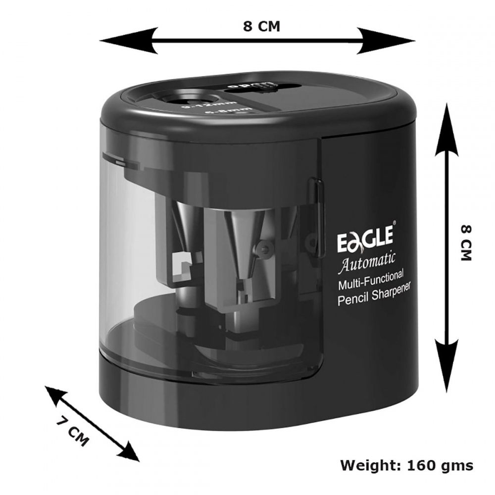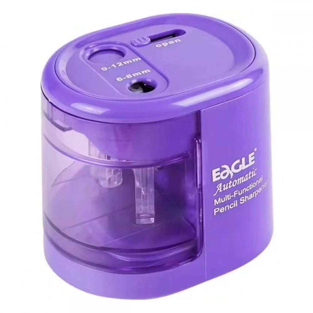 Ořezávátko stolní elektrické. Dva otvorry, pro tužky o velikosti 6–8 a 9–12 mm, zámek s mikrospínačem bezpečný pro děti, vyměnitelné nože, pro baterie AA (4 ks, nejsou součástí balení), kabel USB, stabilní základna
