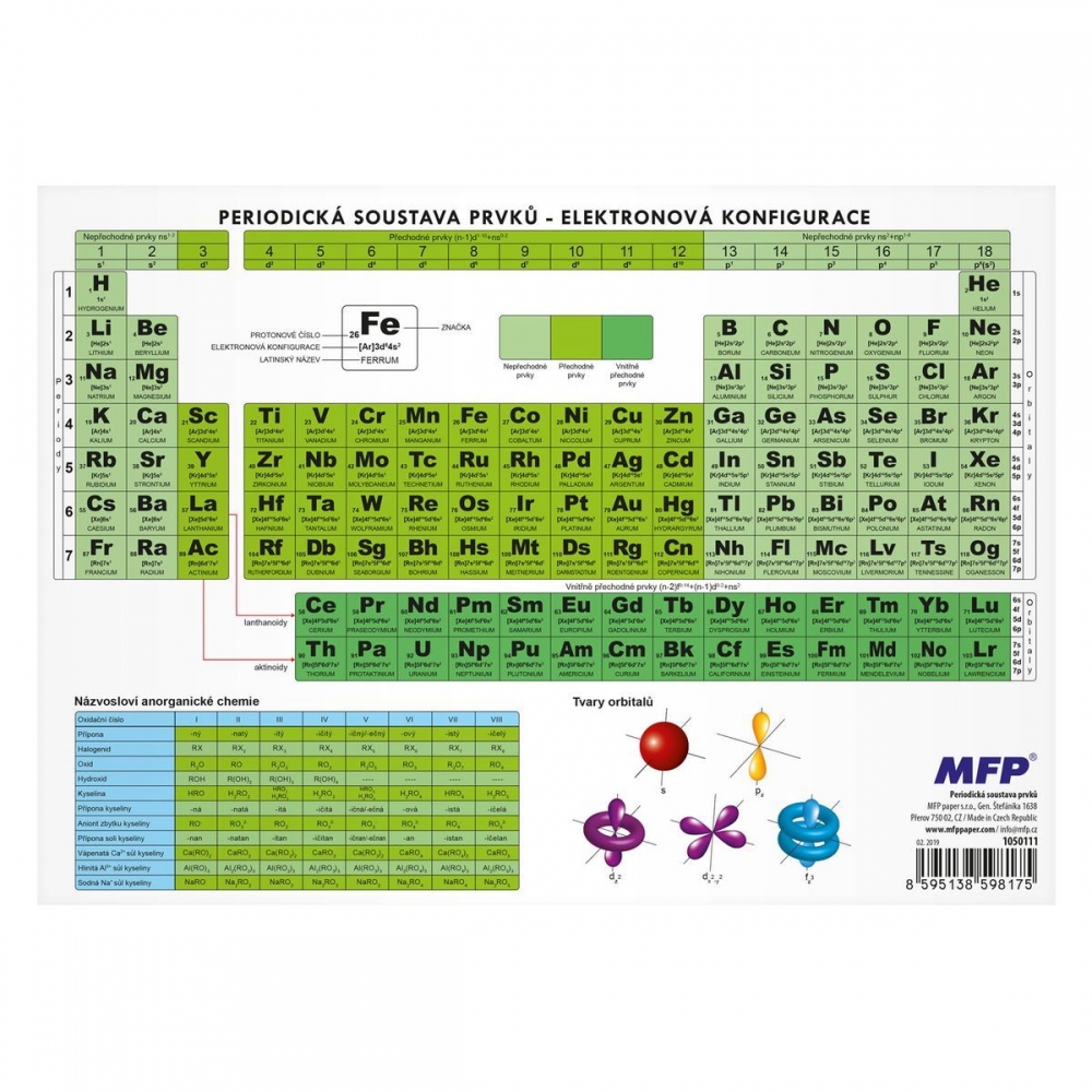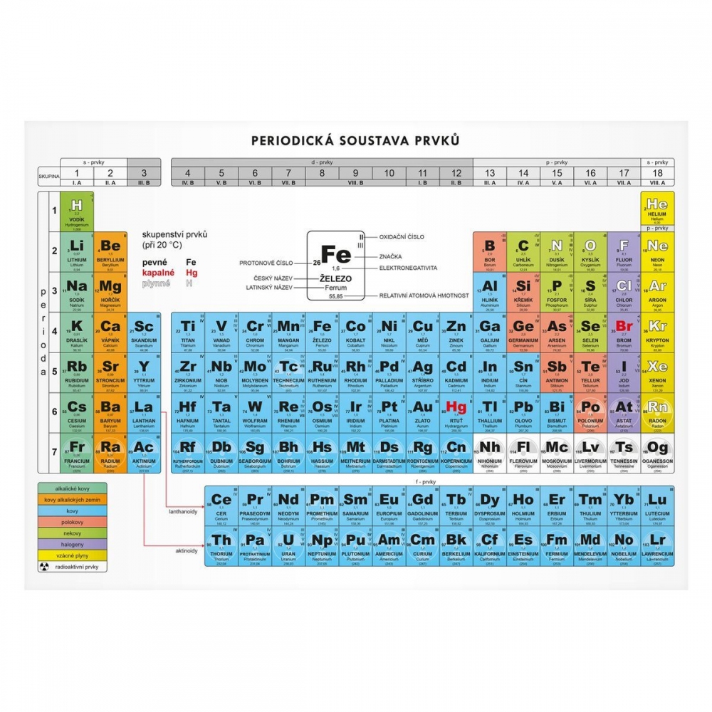 Periodická tabulka prvků - výuková tabulka. Vhodný doplněk k výuce chemie na základních a středních školách. Najdete zde chemickou značku prvku, český a latinský název, oxidační číslo, elektronegativitu, protonové číslo, hmotnostní číslo a elektronová konfigurace. Prvky jsou rozděleny do skupin, radioaktivní prvky, vodík, alkalické kovy, kovy alkalických zemin, kovy, polokovy, nekovy a vzácné plyny. Velikost tabulky A4