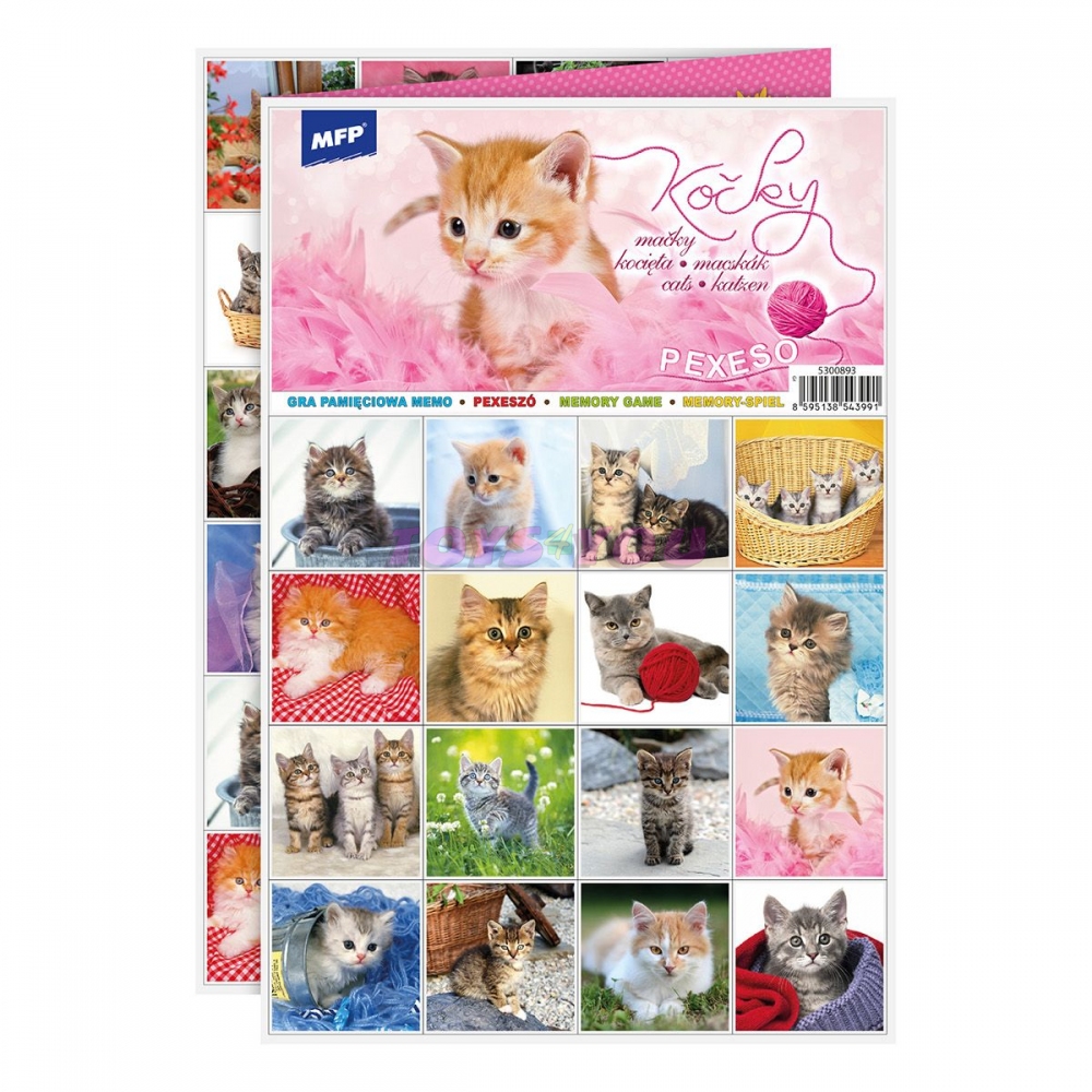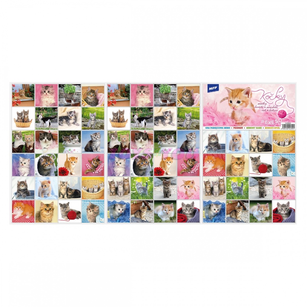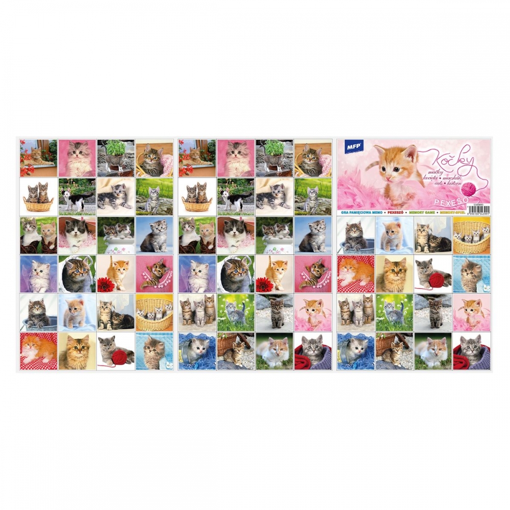 PEXESO je populární dětská stolní hra, která nikdy neomrzí a zapojit se můžou i dospělí. Pexeso - Kočky. Vhodné pro děti, které mají rádi kočky. Věděli jste, že slovo PEXESO vzniklo souslovím slov PEKELNĚ SE SOUSTŘEĎ? Výborná učební pomůcka pro děti a rodiče. Naučte své děti poznávat zvířata a procvičujte jejich paměť. Tato hra je zabaví na dlouhé hodiny. Pexeso se skládá ze tří A4, na kterých najdete 64 kartiček s obrázky koček a návod ke hře. NÁVOD KE HŘE PEXESO: Pexeso mohou hrát nejméně dva hráči. Všechny rozstříhané kartičky zamíchají a rozloží obrázkem dolů do čtverce 8 x 8 kartiček. Nesmí se při tom dívat na obrázek. Hráči si určí pořadí hry. Hráč otočí dvě libovolné kartičky tak, aby si i ostatní spoluhráči mohli obrázky a jejich umístění zapamatovat. Pokud nemají kartičky stejné obrázky, otočí je a vrátí na původní místo. Pokračuje další hráč, který je na řadě. Jestliže objeví stejné obrázky, získává bod a obě kartičky vyřadí ze hry. Pokračuje do té chvíle, kdy otočí dva různé obrázky. Vyhrává hráč, který získá více bodů. PAPÍR: křída matná 350g + lamino lesk 1/1 VELIKOST HRACÍCH KARET: 51x51cm VAROVÁNÍ: Nevhodné pro děti do 3 let. Nebezpečí vdechnutí a spolknutí malých částic. Uvedená cena je za 1 ks. Hmotnost: 0.08 kg Varování: Nevhodné pro děti do 3 let, nebezpečí spolknutí a udušení malými částmi. Výrobek splňuje certifikaci CE Výrobek je určen pro děti od 3 let Rozměr: 210mm x 314mm x 2mm (Š x V x H). Věk: 3+