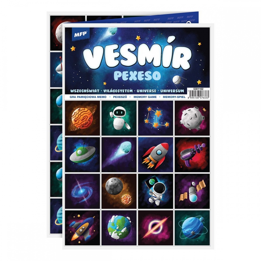 PEXESO je populární dětská stolní hra, která nikdy neomrzí a zapojit se můžou i dospělí. Pexeso - vesmír - slouží pro předškolní děti, které se potřebují naučit něco o vesmíru. S tímto pexesem jim to půjde lehce. Pexeso se skládá ze tří A4, na kterých najdete 64 kartiček malovaných obrázků a návod ke hře. Rozměr: 210mm x 314mm x 2mm (Š x V x H). Věk: 3+