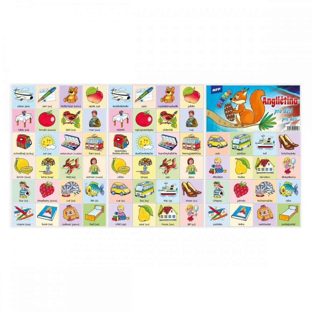 PEXESO je populární dětská stolní hra, která nikdy neomrzí a zapojit se můžou i dospělí. Pexeso - Angličtina pro děti - je vhodné pro děti, které se chtějí naučit anglicky. Pexeso se skládá ze tří A4, na kterých najdete 64 kartiček základních slovíček a návod ke hře - české i anglické názvy se správnou výslovností. Rozměr: 210mm x 314mm x 2mm (Š x V x H). Věk: 3+