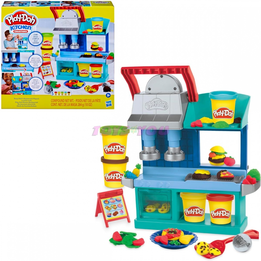 Obsah balení Obsahuje sadu na hraní restaurací, 4 razítka, hnětací váleček, jídelní tabulku, obracečku na pánve, hnětací nůž, 4 talíře a 5 plechovek Play-Doh (čistá hmotnost 284 g). Popis produktu Stručný popis Vítejte v barevné restauraci Play-Doh. Zde mohou děti provozovat vlastní restauraci. Vznikají skvělé hnětací pokrmy Play-Doh a lze je pak podávat hostům. Se snadno instalovatelnými razítky lze připravit pizzu, hamburgery, těstoviny nebo kuře z Play-Doh a po stisknutí páčky vzniknou dokonce 2 hnětací pokrmy současně. Uvolněním páky se pokrmy kloužou na nejbližší stanici. Skvělá zábava pro děti, když potoppingy pro hamburgery, nádherné hranolky, bláznivé cookies a další s poloformami na obou stranách hrací sady. Po přípravě můžete pokrmy na talíři ozdobit a podávat přátelům oknem. Malá jídelní tabule a další kuchyňské doplňky jsou připraveny pro ještě větší zábavu při hraní. Tato sada se hodí pro chlapce a dívky od 3 let a je skvělým dárkem pro děti, které mají rádi kuchyňské hračky. Hasbro, Play-Doh a všechny související vlastnosti jsou ochranné známky Hasbro. Věk: 3+