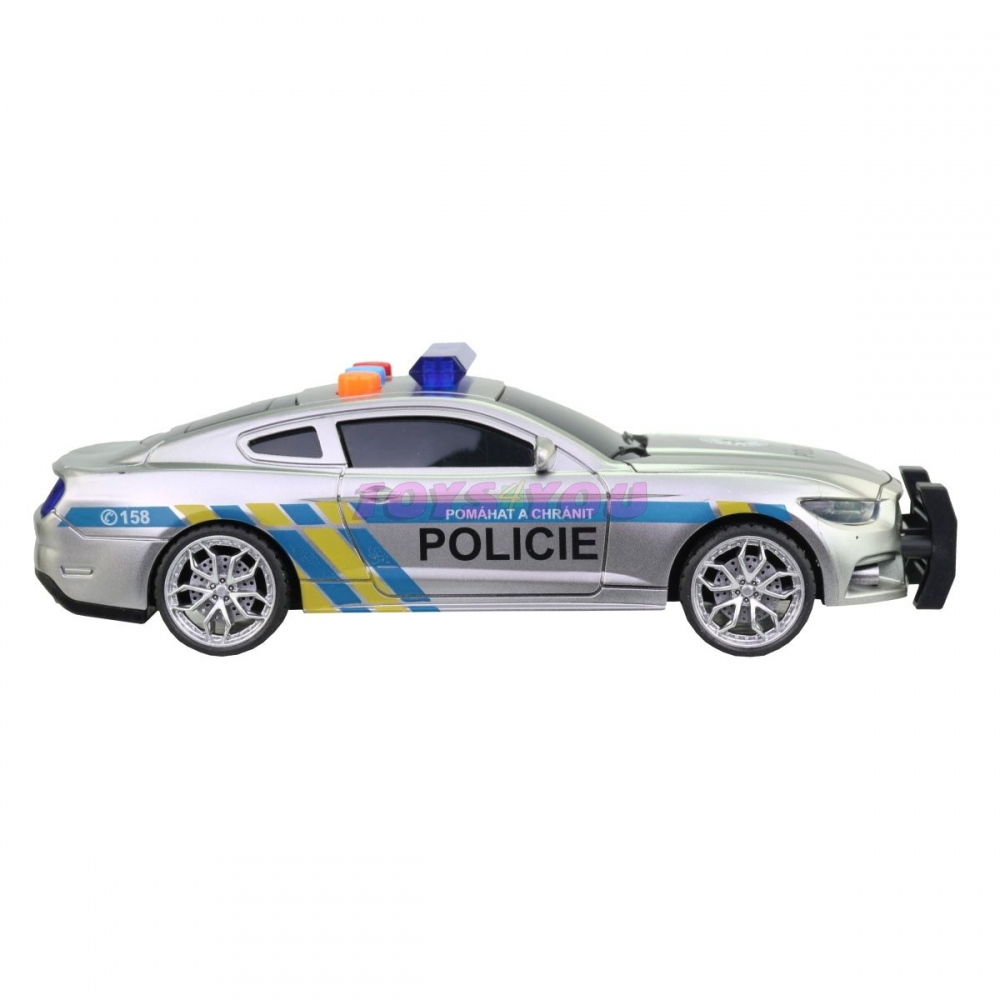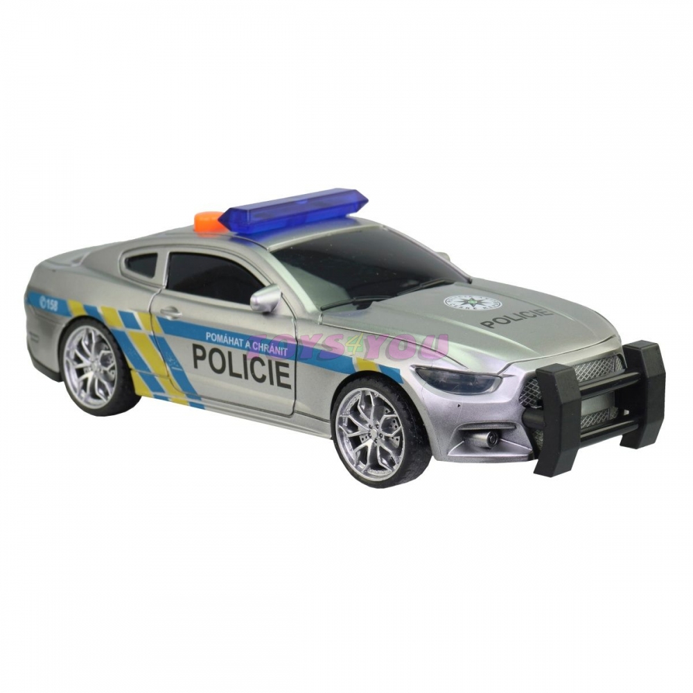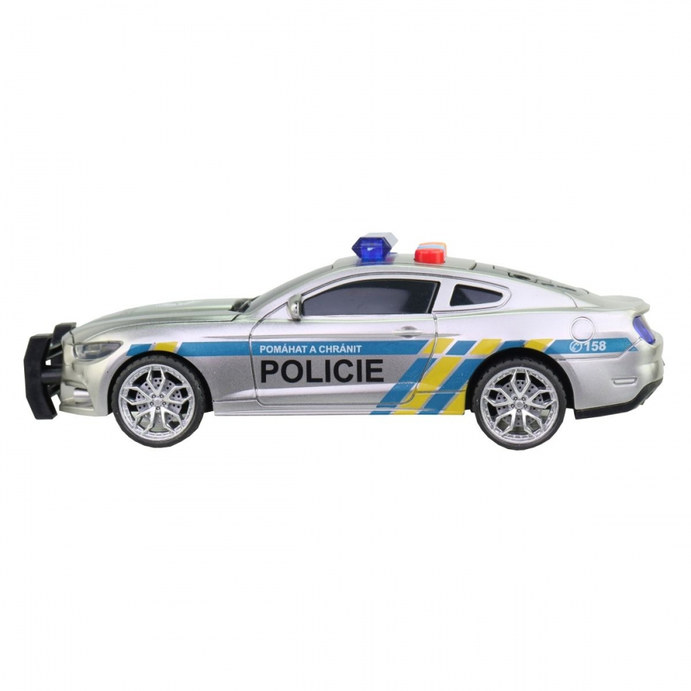 Policejní auto na setrvačník, 17 cm, světlo, zvuk, české věty posádky a dispečinku. Posádka - ,,Sledujeme podezřelé osoby u obchodního centra. Žádáme posily a povolení k zásahu. " Dispečink - ,,Posíláme na místo další hlídky. Zásah povolen." Na baterie: 3 x AG13 baterie jsou součástí balení. Doporučený věk: 3+