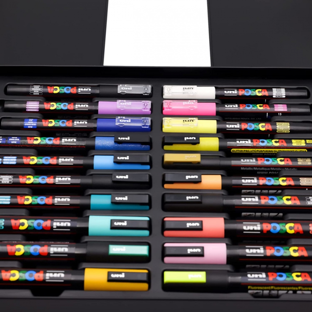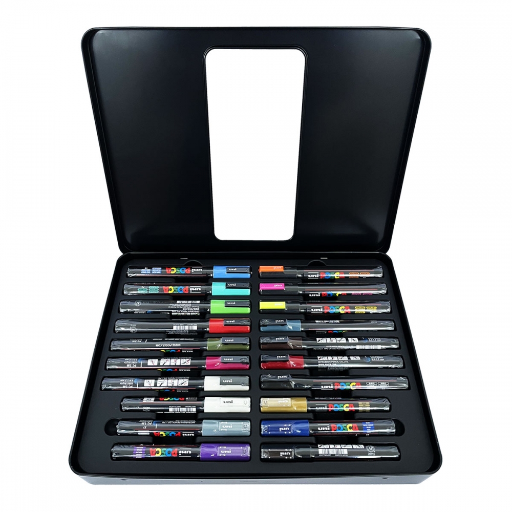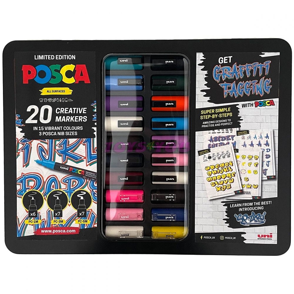 Limitovaná edice Posca Graffiti Tagging obsahuje 20 různobarevných popisovačů ve velikostech 1M, 3M a 5M, exkluzivní vzory od umělce SPZero, barevné návody dvou graffiti stylů a cvičné listy. Vše zabalené v praktické plechové krabičce, která je vhodná i jako dárkové balení. Obsahuje: 6ks PC-1M, 7ks PC-3M, 7ks PC-5M, sytá barva, vynikající hustota, vnitřní i venkovní použití, po zaschnutí voděodolná