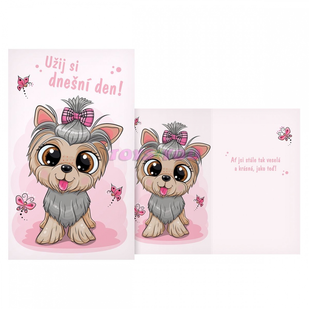Přání dětské. Krásné přání k narozeninám s obrázkem roztomilého pejska s mašličkou. Určitě tohle krásné přání udělá radost malým slečnám. Text na přední straně: Užij si dnešní den! Text uvnitř přání: Ať jsi stále tak veselá a krásná, jako teď! Papír: pohlednicový karton Přání je baleno v sáčku, součástí balení je i dopisní obálka. Uvedená cena je za 1 ks.. Rozměr: 114mm x 190mm x 1mm (Š x V x H)