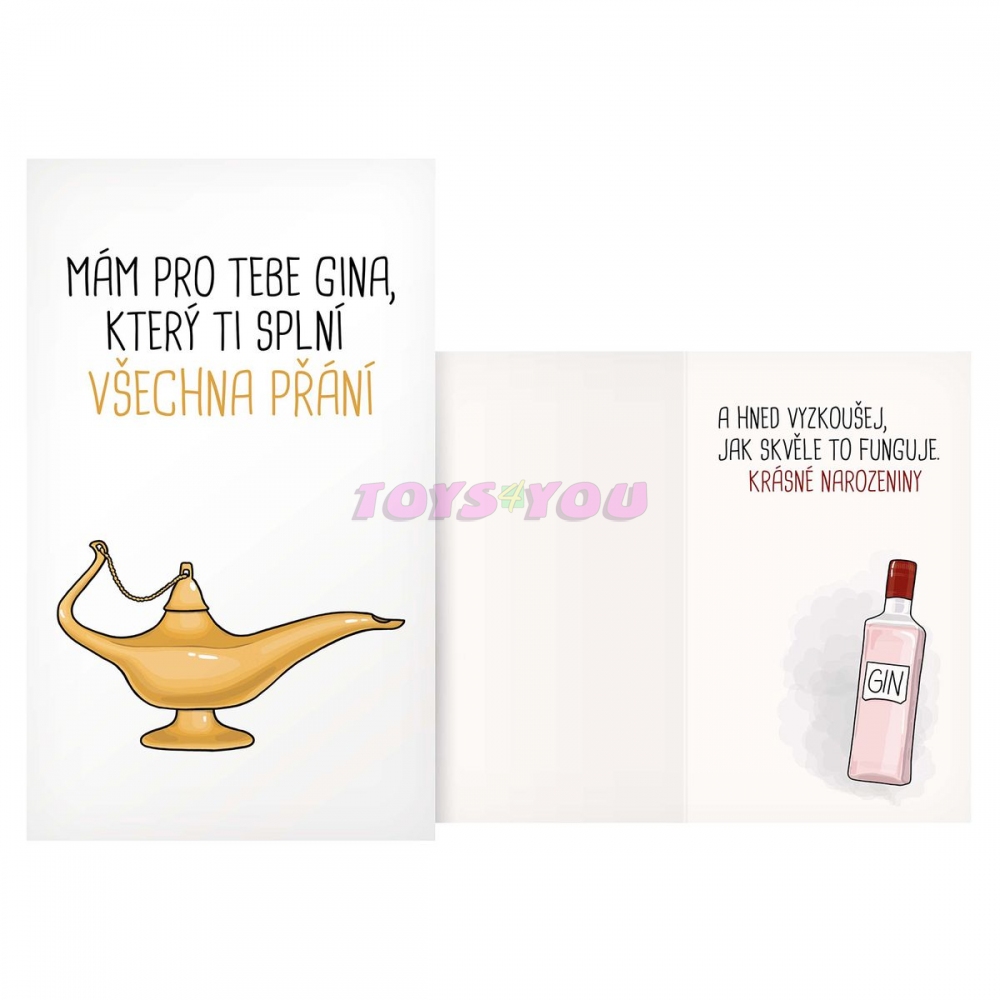 Přání humorné k narozeninám. Přání je s motivem Aladinovy lampy. Oslavy narozenin patří k výjimečným a příjemným okamžikům v životě. Potěšte oslavence a spolu s dárkem mu věnujte originální a krásné přáníčko, které mu bude připomínat tuto radostnou událost. Text na přední straně: MÁM PRO TEBE GINA, KTERÝ TI SPLNÍ VŠECHNA PŘÁNÍ Text uvnitř přání: A HNED VYZKOUŠEJ, JAK SKVĚLE TO FUNGUJE. KRÁSNÉ NAROZENINY Papír: pohlednicový karton Přání je baleno v sáčku, součástí balení je i dopisní obálka. Uvedená cena je za 1 ks. Hmotnost: 0.02 kg Rozměr: 125mm x 200mm x 2mm (Š x V x H) Vyrobeno v EU. . Uvedená cena je za 1 ks.