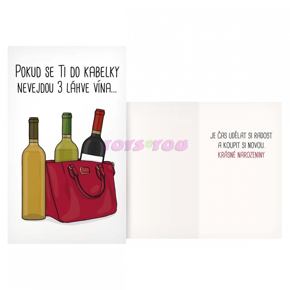 Přání humorné k narozeninám. Přání je s motivem kabelky a lahví vína. Oslavy narozenin patří k výjimečným a příjemným okamžikům v životě. Potěšte oslavenkyni a spolu s dárkem ji věnujte originální a krásné přáníčko, které jí bude připomínat tuto radostnou událost. Text na přední straně: POKUD SE TI DO KABELKY NEVEJDOU 3 LÁHVE VÍNA... Text uvnitř přání: JE ČAS UDĚLAT SI RADOST A KOUPIT SI NOVOU. KRÁSNÉ NAROZENINY Papír: pohlednicový karton Přání je baleno v sáčku, součástí balení je i dopisní obálka. Uvedená cena je za 1 ks. Hmotnost: 0.02 kg Rozměr: 125mm x 200mm x 2mm (Š x V x H) Vyrobeno v EU. . Uvedená cena je za 1 ks.