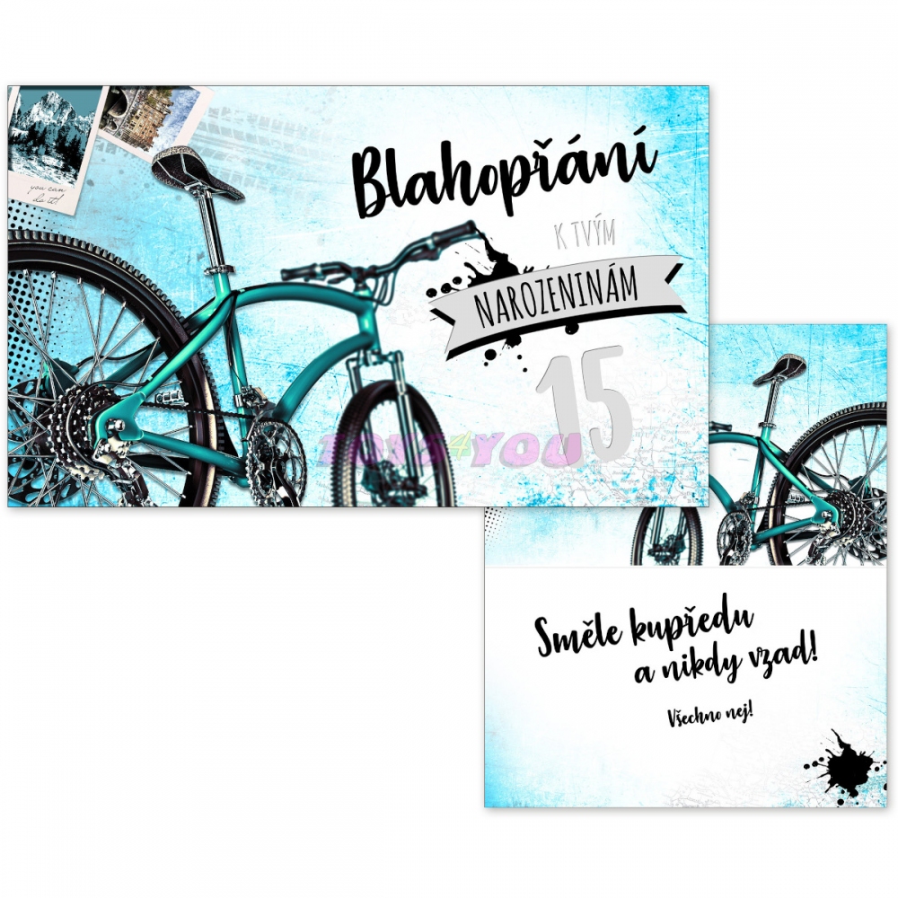 Přání k 15. narozeninám s textem. Přání je s obrázkem kola. Oslavy narozenin patří k výjimečným a příjemným okamžikům v životě. Potěšte oslavence a spolu s dárkem mu věnujte originální a krásné přáníčko, které mu bude připomínat tuto radostnou událost. Text na přední straně přání: Blahopřání k tvým narozeninám 15 Text uvnitř přání: Směle kupředu a nikdy vzad! Všechno nejí! Papír: pohlednicový karton 240 g Přání je baleno v sáčku, součástí balení je i dopisní obálka. Uvedená cena je za 1 ks. Rozměr: 190mm x 114mm x 1mm (Š x V x H) Vyrobeno v EU.