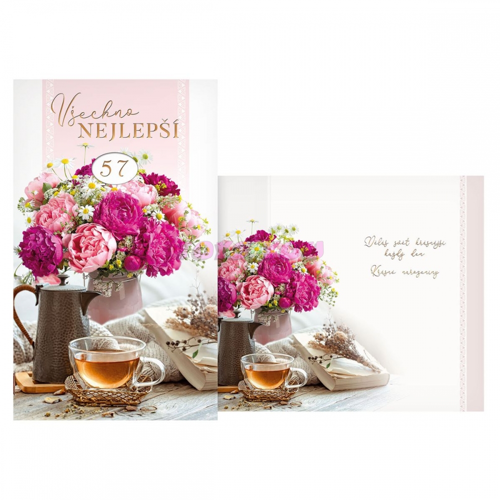 Přání otočné k narozeninám s textem. Přání je s obrázkem kytice květin a šálkem čaje. Díky dvěma otočným kolečkám můžete na přání nastavit požadovaný věk od 10 do 99 let. Oslavy narozenin patří k výjimečným a příjemným okamžikům v životě. Potěště oslavence a spolu s dárkem mu věnujte originální a krásné přáníčko, které mu bude připomínat tuto radostnou událost. Text na přední straně přání: Všechno nejlepší Text uvnitř přání: Děláš svět krásnější každý den Krásné narozeniny Papír: pohlednicový karton 240 g Přání je baleno v sáčku, součástí balení je i dopisní obálka. Uvedená cena je za 1 ks.