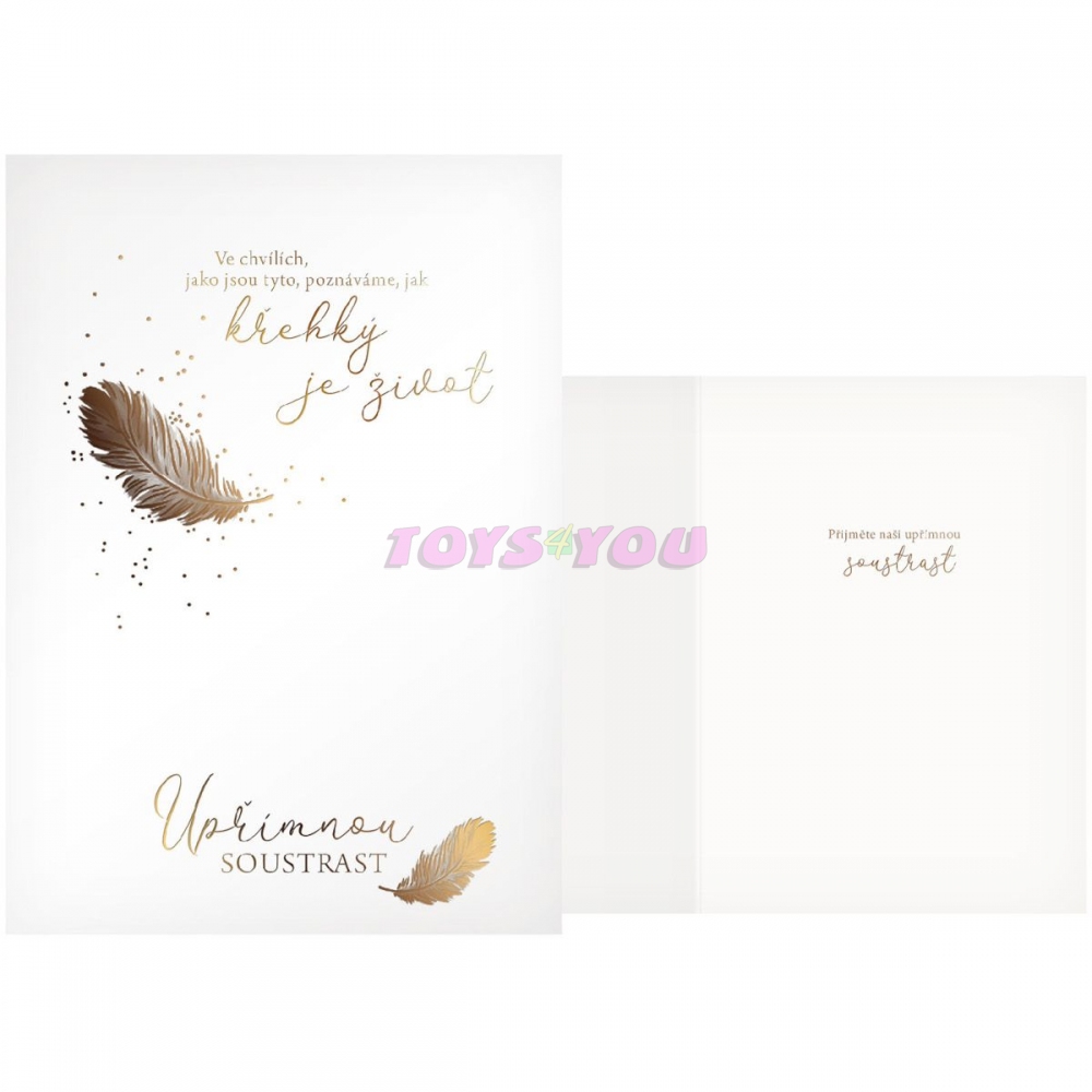 Úmrtí blízké osoby je vždy tragická událost. Vyjádřete kondolencí upřímnou soustrast a soucit pozůstalým. Kondolenční přání a smuteční květiny Vám zajistí důstojné rozloučení s Vaším blízkým člověkem. Text na přední straně přání: Ve chvílích, jako jsou tyto, poznáváme, jak křehký je život Upřímnou soustrast Text uvnitř přání: Přijměte naši upřímnou soustrast. Papír: pohlednicový karton 240 g Přání je baleno v sáčku, součástí balení je i dopisní obálka. Uvedená cena je za 1 ks. Rozměr: 135mm x 190mm x 2mm (Š x V x H)