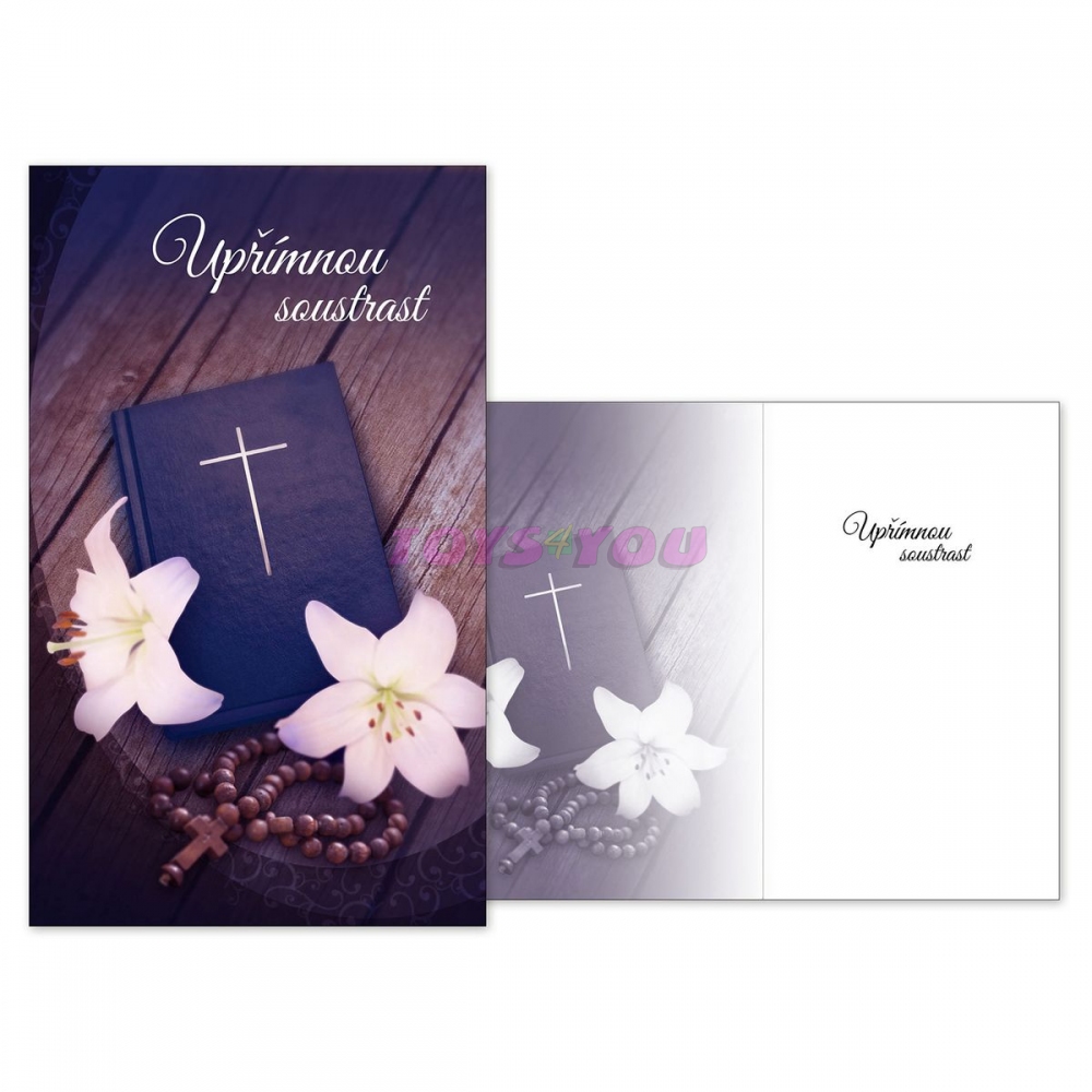 Úmrtí blízké osoby je vždy tragická událost. Vyjádřete kondolencí upřímnou soustrast a soucit pozůstalým. Kondolenční přání a smuteční květiny Vám zajistí důstojné rozloučení s vaším blízkým člověkem. Přání je s obrázkem růžence, knihy a bílých květin. Text na přední straně přání: Upřímnou soustrast Text uvnitř přání: Upřímnou soustrast Papír: pohlednicový karton 240 g Přání je baleno v sáčku, součástí balení je i dopisní obálka. Uvedená cena je za 1 ks. Hmotnost: 0.02 kg Rozměr: 114mm x 190mm x 1mm (Š x V x H) Vyrobeno v EU.