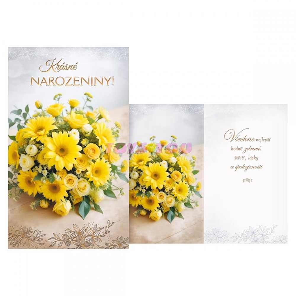 Chtěli byste popřát a zároveň vykouzlit úsměv, který vydrží celý den? S tímto nádherným přáním máte jistotu, že oslava začne ještě dřív, než se rozbalí první dárek! Žluté květy na obálce září jako slunce a doslova volají po radosti, zatímco zlatý nápis „Krásné narozeniny!“ přidává kapku elegance. Udělejte z narozenin nezapomenutelný moment plný radosti, úsměvů a tepla – protože takové chvíle stojí za to oslavit! Text na přední straně: Krásné narozeniny Text uvnitř přání: Všechno nejlepší, hodně zdraví , těstí, lásky a spokojenosti přeje Papír: pohlednicový karton Přání je baleno v sáčku, součástí balení je i dopisní obálka. Uvedená cena je za 1 ks.