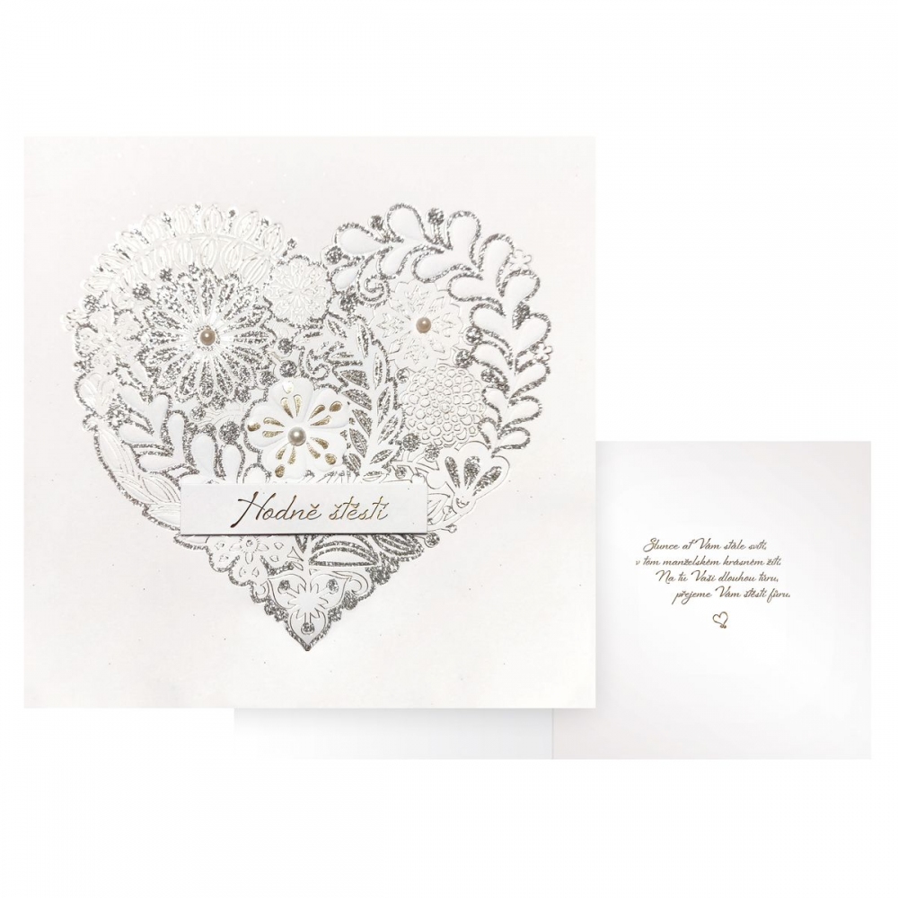 Svatební přání s textem. Svatba je příjemná a mimořádná událost a je začátkem nové etapy života. Mezi svatebními dary by nikdy nemělo chybět i přání novomanželům. Udělejte radost novomanželům a věnujte jim přání k jejich svazku, díky kterému si vždy připomenou krásné začátky jejich manželství. Text na přední straně přání: Hodně štěstí Text uvnitř přání: Slunce ať Vám stále svítí, v tom manželském krásném žití. Na tu Vaši dlouhou tůru, Přejeme Vám štěstí fůru. Papír: pohlednicový karton 240 g Přání je baleno v sáčku. Součástí přání je i obálka. Uvedená cena je za 1 ks. Počet kusů skladem: 36 Hmotnost: 0.80 kg Rozměr: 165mm x 165mm x 1mm (Š x V x H)