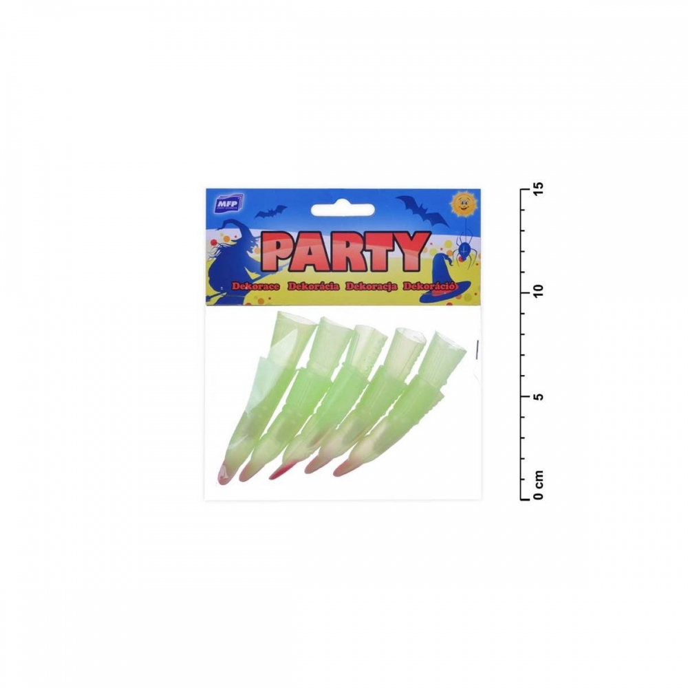 Doplněk ke karnevalové masce svítící prsty. Ideální na Halloween, maškarní ples nebo jinou párty. Prsty ve tmě svítí a váš kostým tak bude vypadat hrůzostrašně. Vyrobeno z plastu, výrobek je zdravotně nezávadný. Baleno v plastovém sáčku se závěsem.