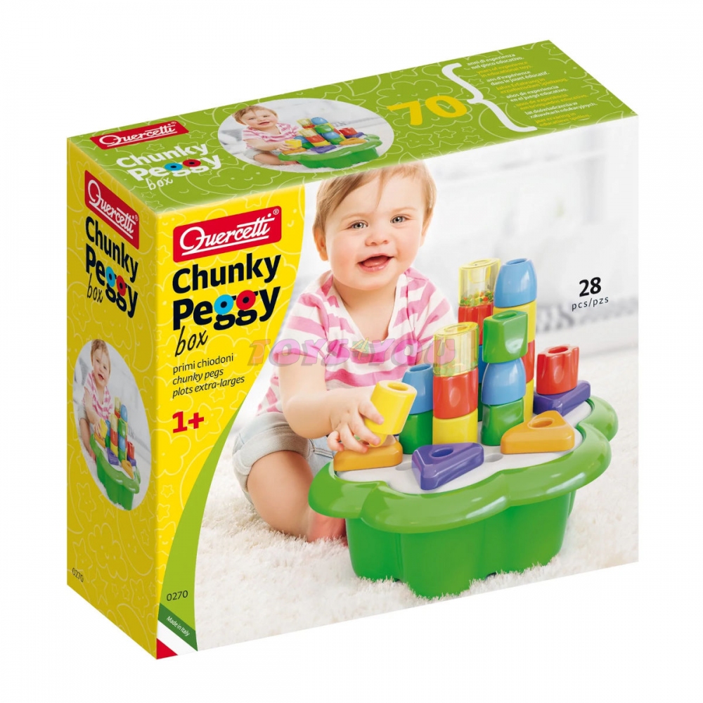 Mozaika a stavebnice v jednom - QUERCETTI Daisy Box Chiodoni pro nejmenší. Děti vkládají jednotlivé díly do podložky a vytvářejí tak své první mozaikové obrazce nebo stavějí na podložce různé výškové stavby. Balení obsahuje 26 velkých dílů, 1 box a 1 hrací desku ve tvaru květiny. Tyto hračky u děti rozvíjejí jemnou motoriku, tvořivost a schopnost rozeznávat barvy a tvary. Podložky jsou z měkkého ohebného plastu špičkové kvality a všechny díly jsou omyvatelné. Věk: 1+