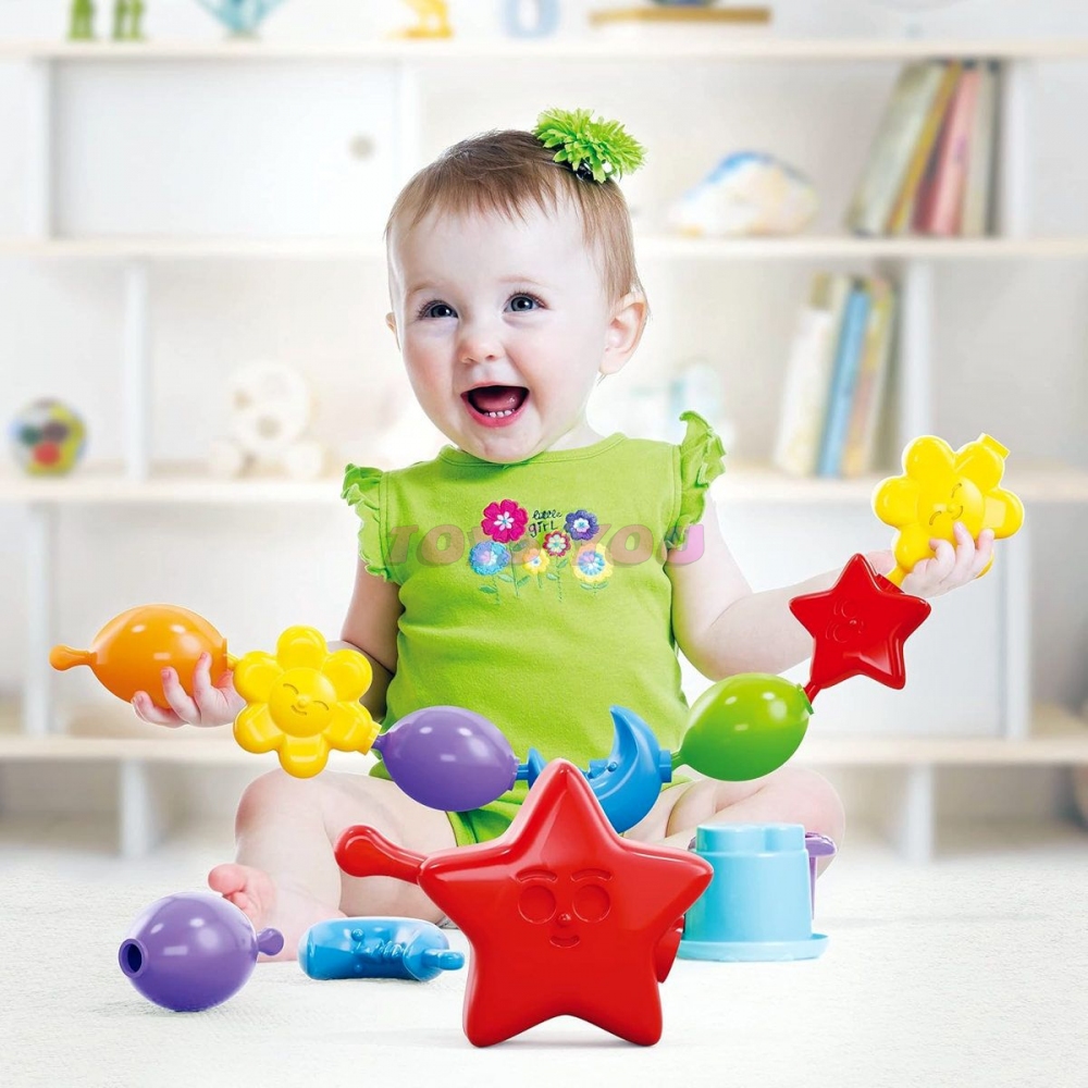 Tyto neuvěřitelně lehké a barevné do sebe zapadající velké korálky přicházejí v různých tvarech, které lze snadno rozpoznat a manipulovat s nimi; děti se zabaví při jejich spojování a vytváření dlouhých náhrdelníků různých tvarů a barev. Jsou vyrobeny z bezpečného a omyvatelného materiálu a dokonale se hodí pro kojence; navíc jsou tak lehké, že jsou prakticky nehlučné, i když dopadnou na zem. Věk: 1+ let