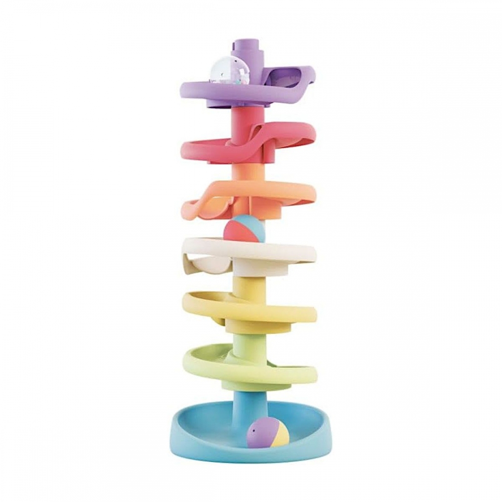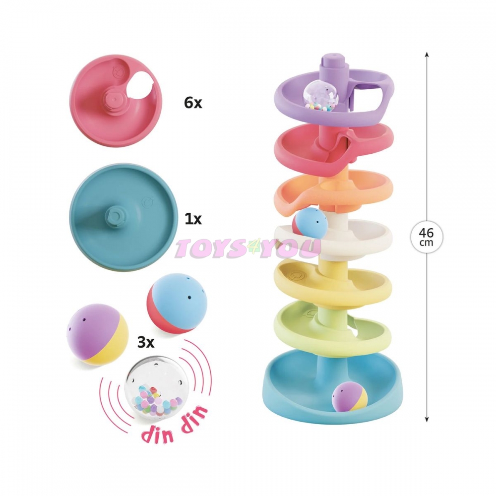 Kuličková dráha pro nejmenší, Quercetti Spiral Tower, vám umožní postavit vysokou věž a vypouštět barevné koule s chrastítky, které vydávají zvuky, když se kutálejí po dráze. Stavba věže skládající se ze 7 snadno sestavitelných prvků v kombinaci s pomalu se pohybujícími míčky jistě upoutá pozornost dítěte, pomůže rozvíjet koordinaci oko-ruka a poznávat příčinu a následek způsobem, který vám umožní tvořit poutavé a bláznivá zábava. Součástí sady jsou i tři míčky s chrastítky, které navíc svými zvuky upoutají pozornost miminka.