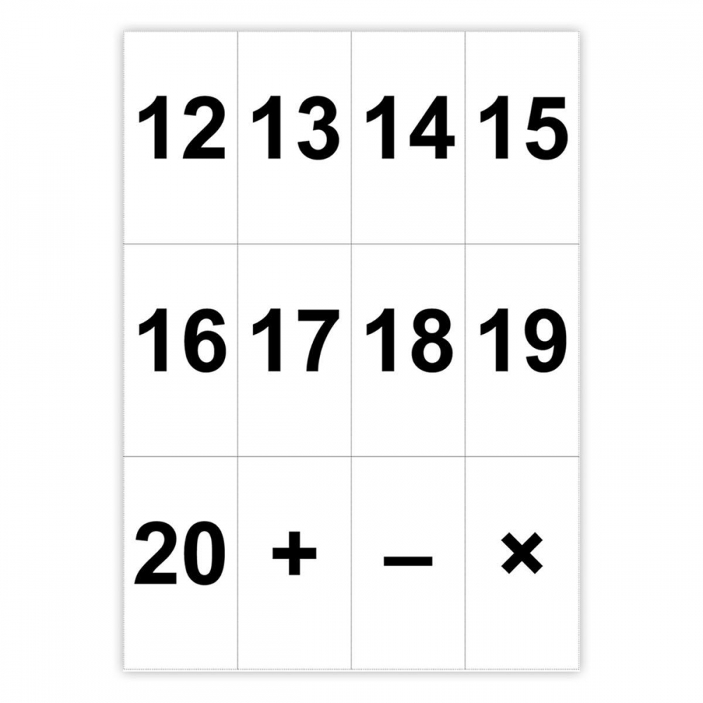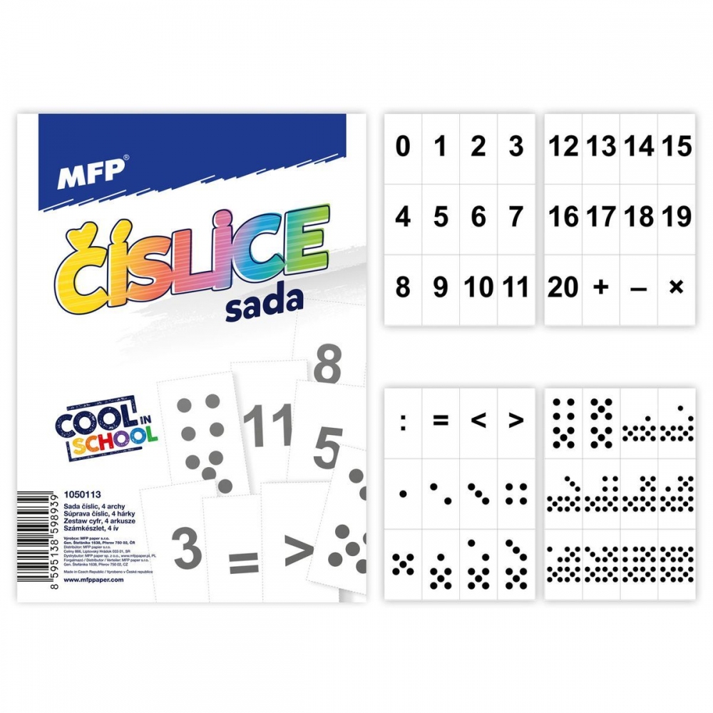 Sada 4ks tisků formátu 170x236mm obsahující číslice a znaky na vystřihnutí, vhodné pro výuku v prvních ročnících základních škol.