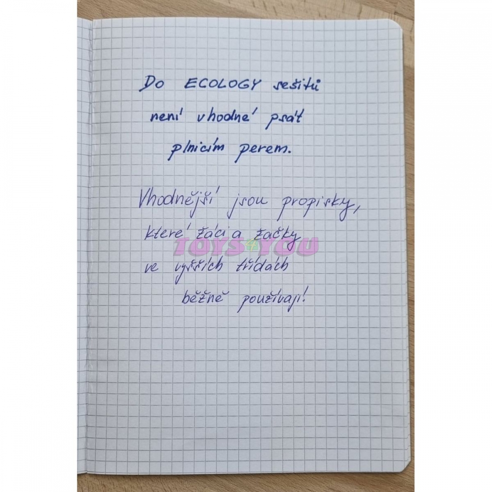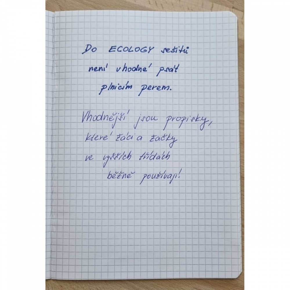 Sešit školní č. 444E - Ecology. A4, 40 listů, s klasickými linkami (8 mm), recyklovaný papír 60 g/m2, obálka 150 g/m2. Sešity jsou určené pro děti od 4. tříd základních škol výše. Klasickou propiskou či gelovkami se na 60gramový ekologický papír píše pohodlně, pro plnicí pera však tyto sešity vhodné nejsou.