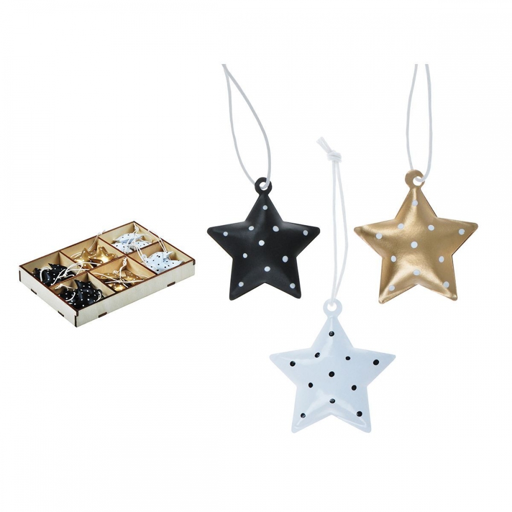 Set vánočních ozdob 18 ks - Vánoce jsou svátky pohody a klidu, a proto je potřeba se na ně pořádně připravit. Vyzdobte si domov touto krásnou dekorací, která Vám navodí pocit přicházejících Vánoc. Vánoční závěsné ozdoby jsou dokonalým doplňkem do každého interiéru. Tato vánoční ozdoba je opatřena očkem a provázkem na zavěšení. Můžete použít na ozdobení vánočního stromečku, zavěsit na dveře, okno a zkrášlit tak Vaše bydlení. SET OBSAHUJE: - 18 ks plechových hvězdiček (černá, zlatá, bílá). Rozměr: 155mm x 105mm x 20mm (Š x V x H)