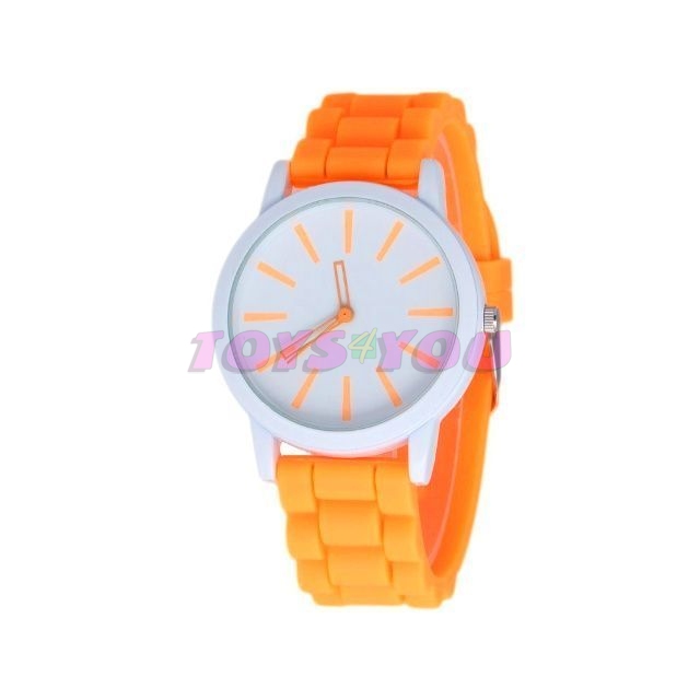 Jednoduché silikonové hodinky, jejichž barva pásku ladí s vnitřkem hodinek.