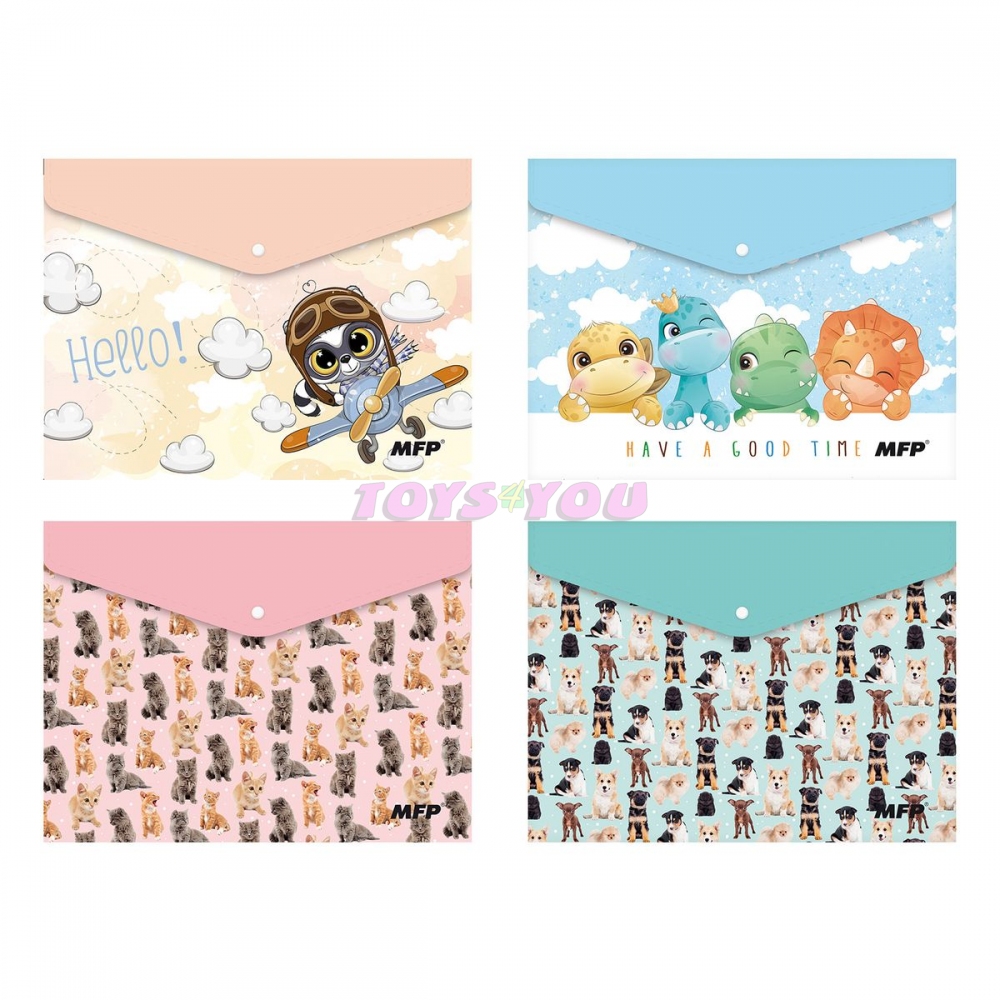 Složka z PolyPropylenu (PP), která se zavírá pomocí druku ve formátu A5, s dětským potiskem, v pastelových barvách. Složka slouží jako pomocník pro třídění a ukládání dokumentů, takže je budete mít vždy pohromadě. MATERIÁL: PP SÍLA MATERIÁLU: 0,21 mm BARVA: oranžová, modrá, růžová, tyrkysová POTISK: letadlo, dinosauři, koťátka, štěňátka Dodáváme v mixu po 4 ks dle skladové zásoby. Uvedená cena je za 1 ks. Rozměr: 260mm x 190mm x 5mm (Š x V x H)