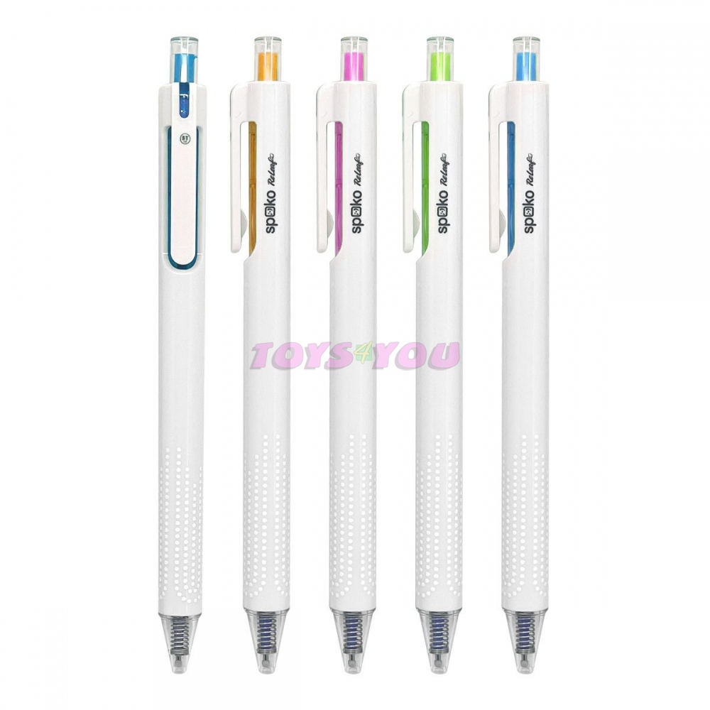 Gelové pero s velkokapacitní náplní, jedinečným tenkým hrotem „ST“ a tichou stiskací mechanikou „Silent click“. Nový typ hrotu „ST“ v sobě kombinuje vlastnosti klasické kuličky a jehlového hrotu. Díky tomu je psaní lehké, plynulé a stopa jasná a konstantní i při rychlém psaní. Protiskluzový úchop v barvě těla. Horní část pera s barevnými akcenty. Vyrobeno z 85 % z recyklovaného plastu.