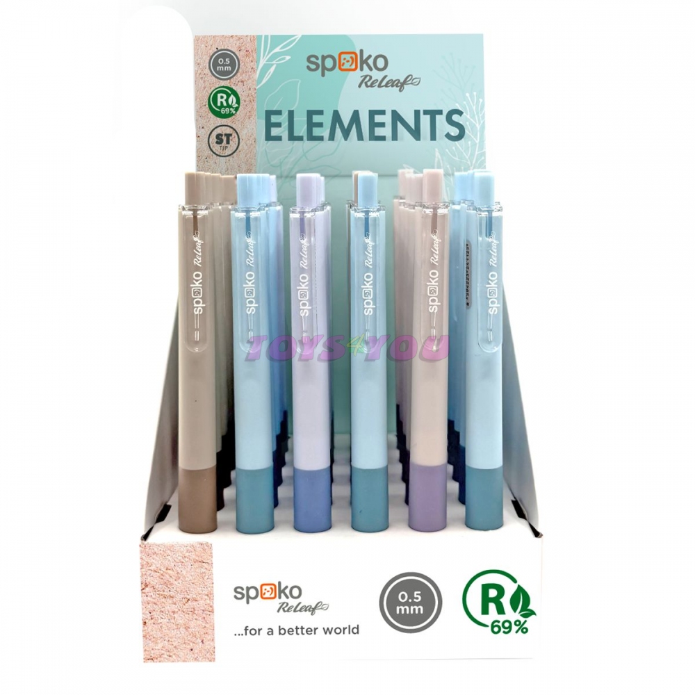 Spoko ReLeaf je nová řada produktů značky Spoko, která přistupuje zodpovědně k životnímu prostředí a při výrobě svých produktů využívá převážně recyklované materiály. Jednotný design balení usnadňuje identifikaci produktů Spoko ReLeaf mezi ostatními výrobky Spoko. Gelové pero v jemných tlumených barvách, inspirované přírodními živly. Monochromatické matné tělo s protiskluzovou úchopovou zónou. Transparentní plastový klip a stiskací mechanika v barvě těla. Tištěné logo v bílé barvě. Velkokapacitní gelová náplň s jedinečně tenkým a odolným „ST“ hrotem zaručí konstantní a jasnou stopu a pocit lehkého a plynulého psaní. Vyrobeno z 69 % recyklovaného plastu. šířka stopy: 0,5 mm modrá náplň materiál: 69% recyklovaný plast náhradní náplň: S0291 mix barev: fialová, krémová, sv. modrá, hnědá ST Tip – odolný a tenký hrot pro rychlé nebo energické psaní