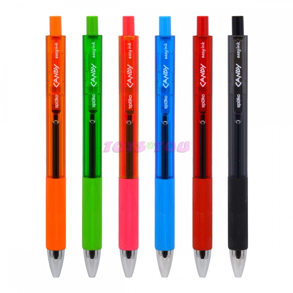 Stiskací kuličkové pero řady CANDY s příjemným trojhranným úchopem pro komfortní držení a psaní. Tělo má atraktivní barevný design v kombinaci se stříbrnou špičkou. Tištěné logo na klipu. Modrá náplň Easy Ink - inkoust s nízkou viskozitou pro pohodlnější a plynulejší psaní. mix 6 barev: oranžová, zelená, červená, modrá, růžová a černá materiál: plast šířka stopy 0,5 mm náhradní náplň S0297. Cenan za jeden kus.