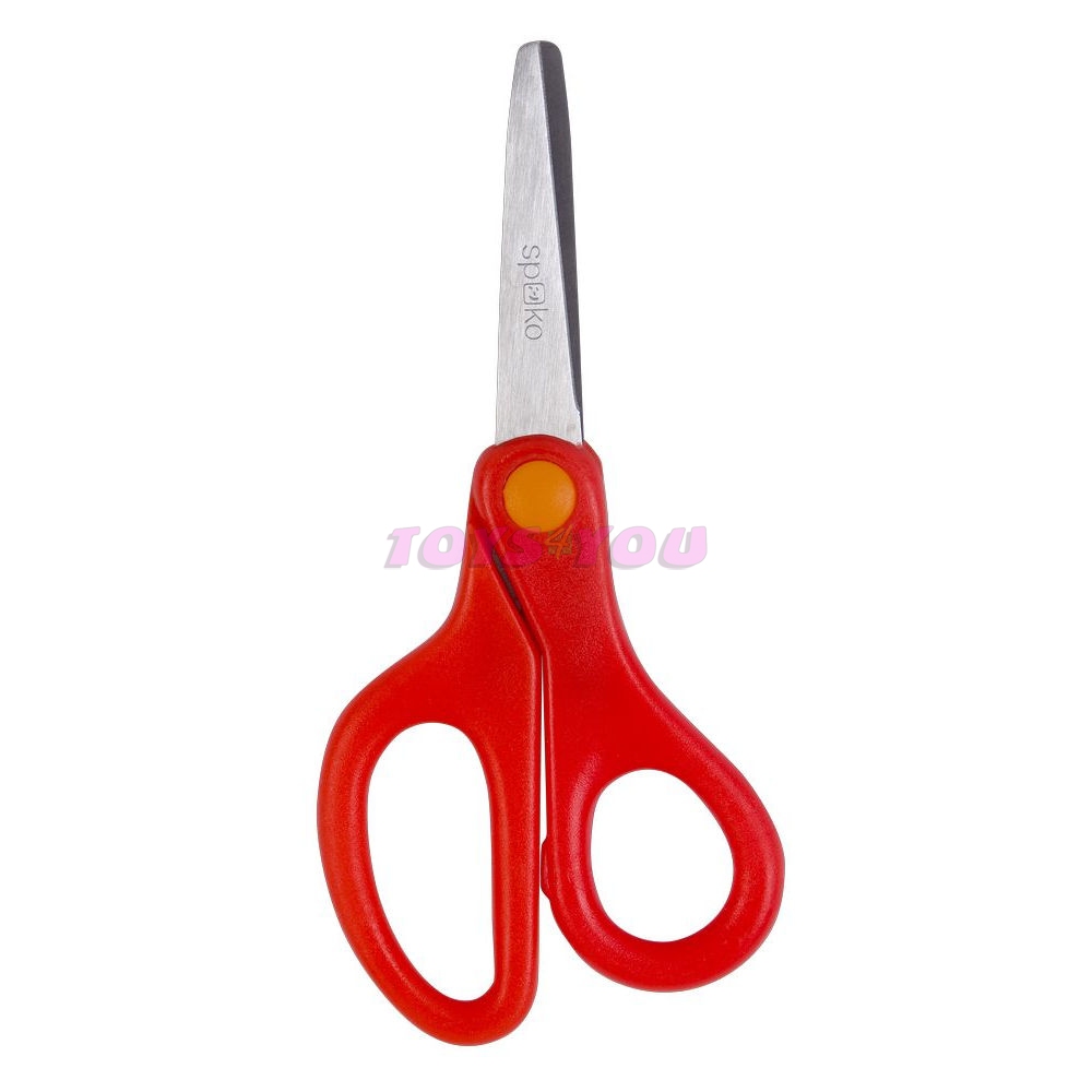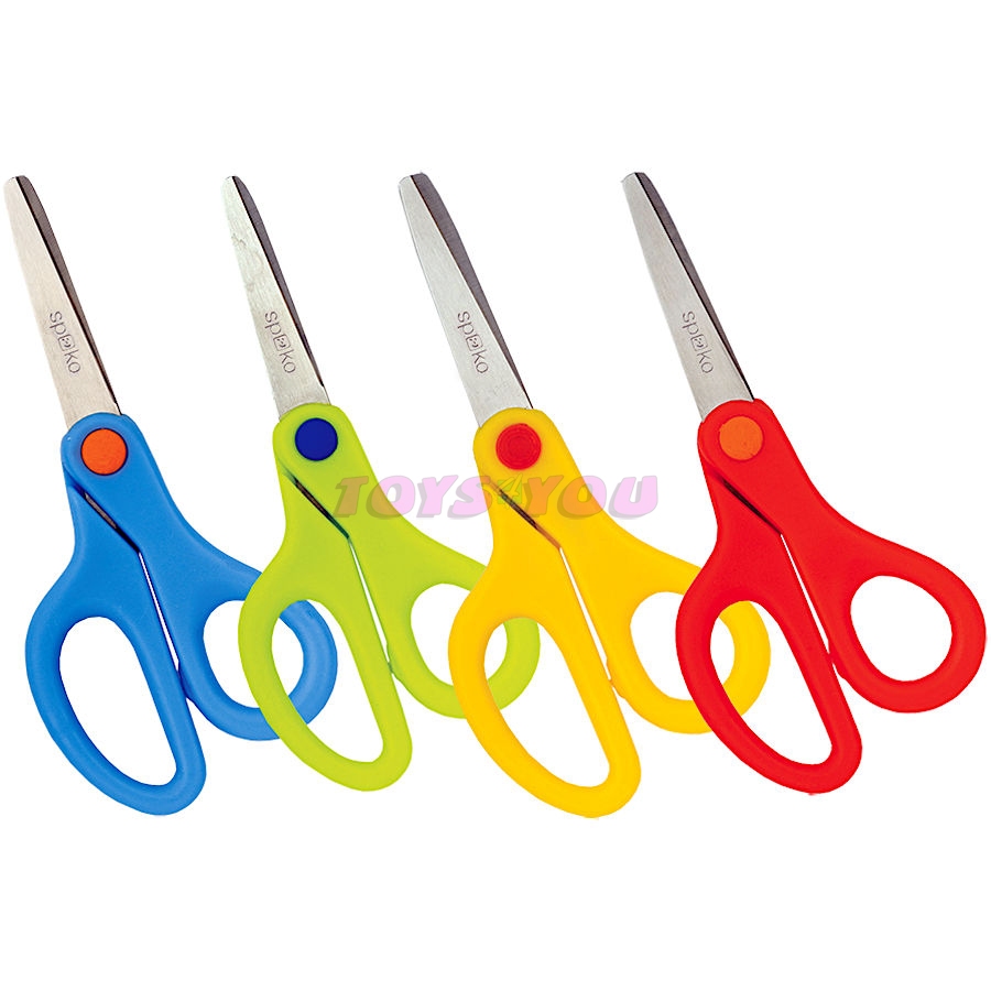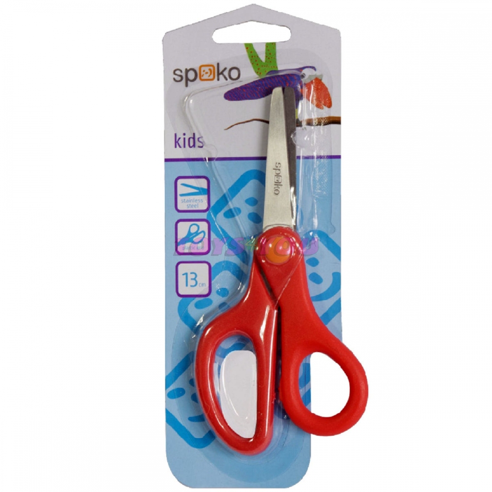 Školní nůžky vel. 13 cm se zakulacenou špičkou a měřítkem na čepeli. Délka nerezové čepele 8 cm. Asymetrické rukojeti jsou kryty měkčeným plastem v různobarevném provedení