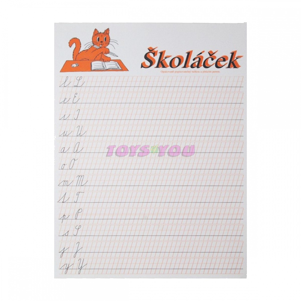 Podložka PRVŇÁČEK A4 plastová ,usnaďnující psaní do řádku, popisovatelná tužkou či mazatelným fixem. Plastová podložka s předepsanými písmenky pro 1.třídu ZŠ Podložka je popisovatelná tužkou, mazatelným fixem. Mazání gumou, vlhkým hadříkem, u speciálních fixů suchým hadříkem. Materiál: PVC tvrdé, tloušťka 0,3 mm + papír. Předepsaná písmena abecedy. Laminace v PES fólii. Určeno pro žáky 1.třídy ZŠ. Formát A4