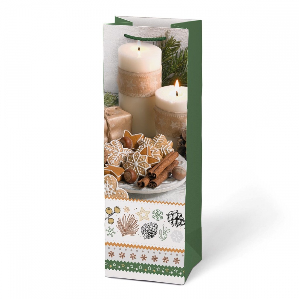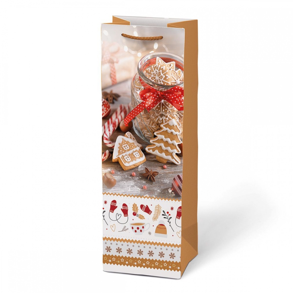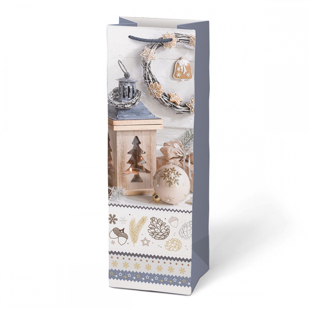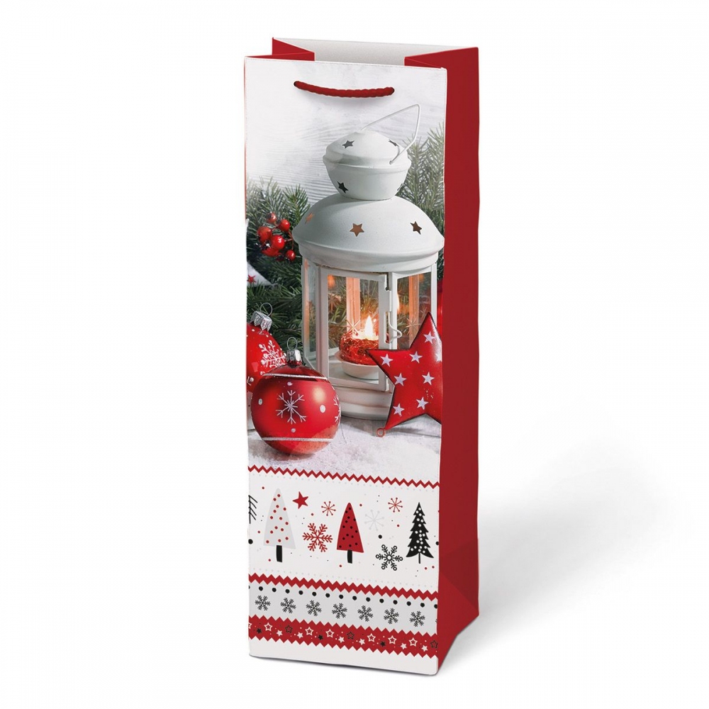 Vánoční dárková papírová taška T12 na víno nebo jinou lahvinku. Taška je opatřena pevným uchem pro snadné nošení. Motiv: mix vánočních motivů Rozměr: 120 x 360 x 100 mm Dodáváme v mixu po 4 ks dle skladové zásoby. Uvedená cena je za 1 ks. Rozměr: 120mm x 360mm x 100mm (Š x V x H)