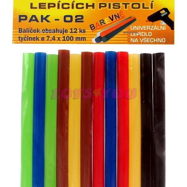 Tavná lepicí tyčinka o průměru 7,4 x 100 mm, dodávaná v blistrovém balení po 12 ks v různých barvách. Tavné lepidlo 101C