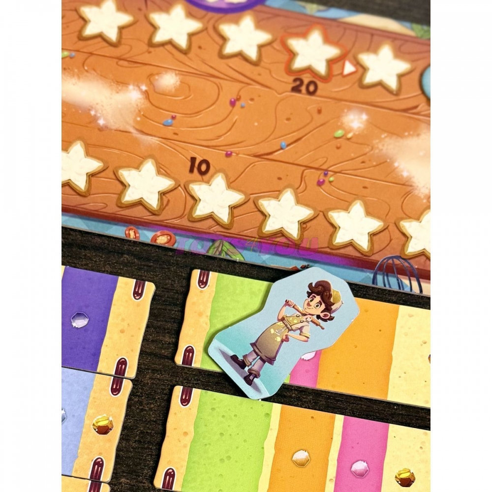 Buďte u toho a zúčastněte se! Cukr, skořice a dobrý odhad – více toho k úspěchu v Turnaji ve zdobení dortů nepotřebujete. Vrstvu po vrstvě skládáte svůj dort. Pečlivě se dívejte a vybírejte barevné dortové korpusy tak, aby se k sobě hodily. Za chytré přiložení získáte kostky cukru, které můžete vyměnit za cenné vítězné body. Všichni hrají současně a napětí každým kolem stoupá.