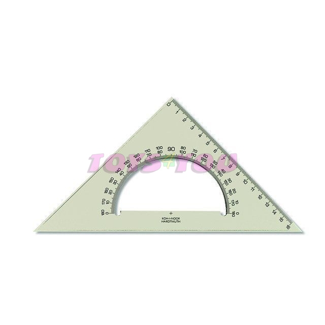 Trojúhelník 45/177 s úhloměrem vyrobený z kouřového průhledného polystyrenu. Stupnice tištěny technologií přesného sítotisku. Tisk stupnic je odolný proti opotřebení při běžném používání. Přesnost délkové stupnice 0,2% délky. Mimo délkové stupnice na odvěsně je trojúhelník vybaven obloukovým výřezem s úhloměrnou stupnicí 0 - 180° k měření a rýsování úhlů. Trojúhelník je určený k technickému kreslení a rýsování ve škole i v kanceláři. Výhodou je spojení trojúhelníku s ryskou a úhloměru 180° v jeden výrobek. Zabalen je do polyetylenového sáčku s eurozávěsem.