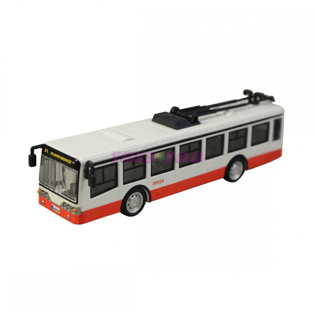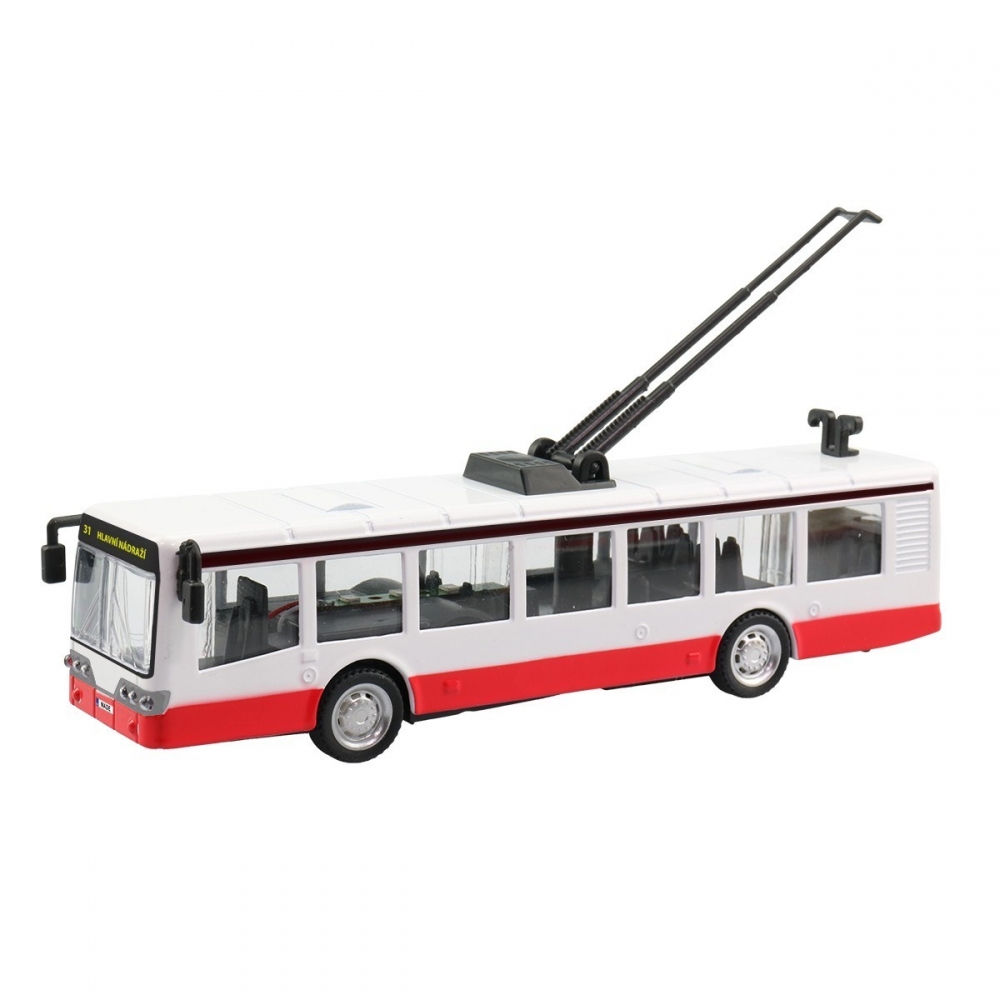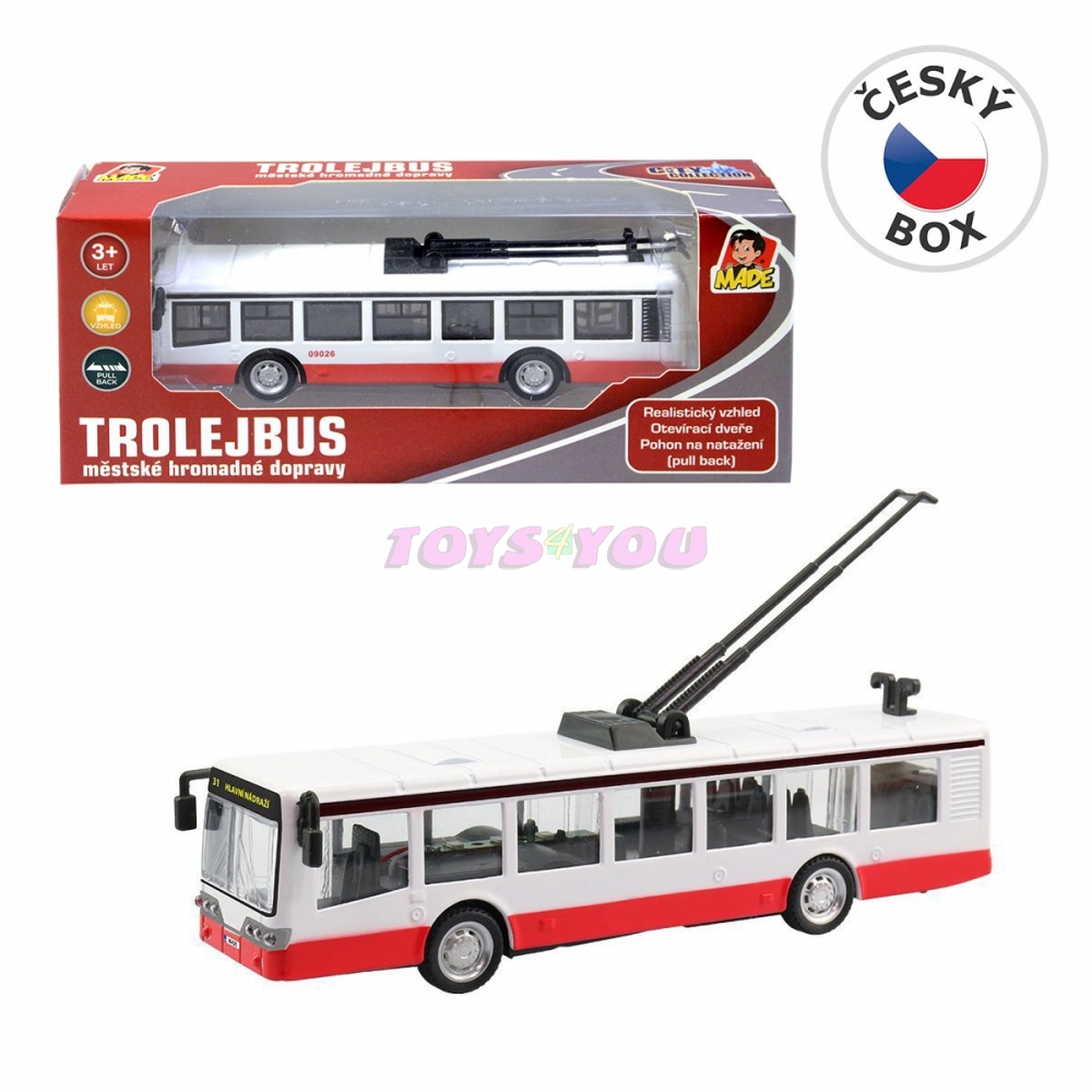 Kovový trolejbus z edice City Collection s realistickým vzhledem v českém designu. Trolejbus má výklopné troleje, otevírací dveře. Pohon je na zpětné natažení. Rozměr trolejbusu 16 cm. Rozměry balení (š v h): 22 x 9 x 6cm, Věk: 3+
